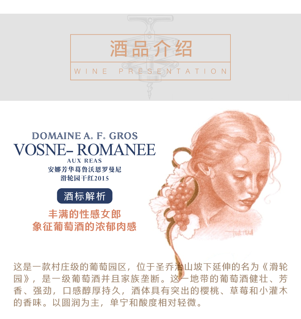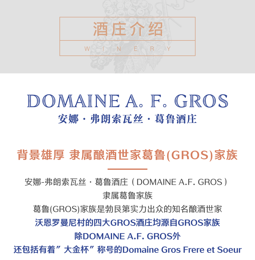 安娜芳华葛鲁酒庄(Domaine A. F. Gros)位于法国勃艮第(Burgundy)伯恩丘(Cote de Beaune)产区,是该产区内一座精品酒庄。AF酒庄的前身是让·葛鲁(Jean Gros)和珍妮·葛鲁(Jeanine Gros)夫妇共同创建的葛鲁-雷诺多(Gros-Renaudot)酒庄。