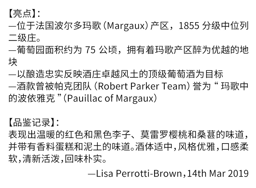 布郎康田的正牌是Chateau Brane Cantenac每一个年份均在50%新的橡木桶中陈酿12至18个月,某些好年份如1982等享有极高的评价,层次感丰富,口感醇厚。副牌是Le Baron de Brane。 布郎康田酒庄(Chateau Brane Cantenac)为Medoc产区最大酒庄之一,由于产量多市场广,使得这支酒名满天下,酒质圆润早熟富含水果味,柔顺容易入口,尤其适宜早饮,轻度醇厚。