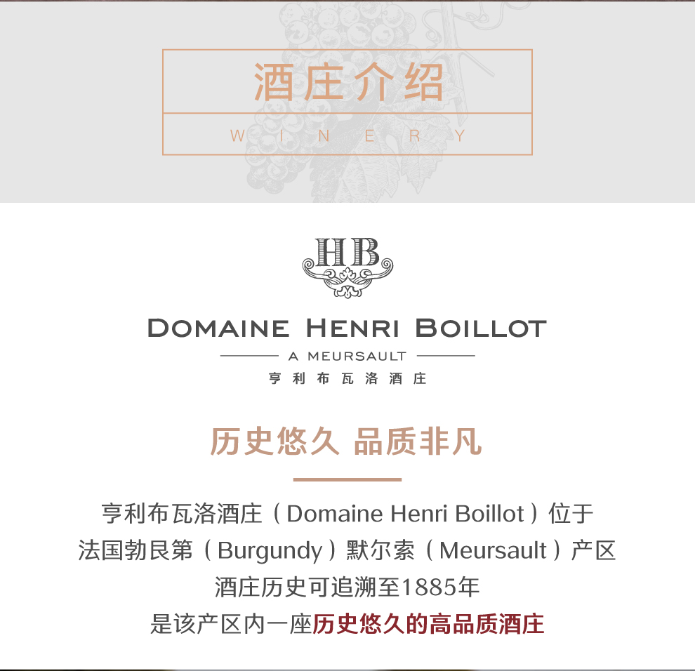 亨利布瓦洛酒庄的历史最早可以追溯到1885年。从那时起,亨利布瓦洛家族就已经开始种植葡萄树并酿酒了。布瓦洛酒庄原名是“Domaine Jean Boillot”,根据亨利布瓦洛家族第四代传人让·布瓦洛(Jean Boillot)的名字命名。2005年,让·布瓦洛的儿子亨利·布瓦洛(Henry Boillot)将其他兄妹名下的产业股权买了下来,并将这些产业重新整合为一个酒庄,最后改名为“Domaine Henri Boillot”。酒庄目前的庄主亨利·布瓦洛是布瓦洛家族的第五代传人。近几年,他的儿子吉月莫(Guillaume)也加入到酒庄的经营中来。