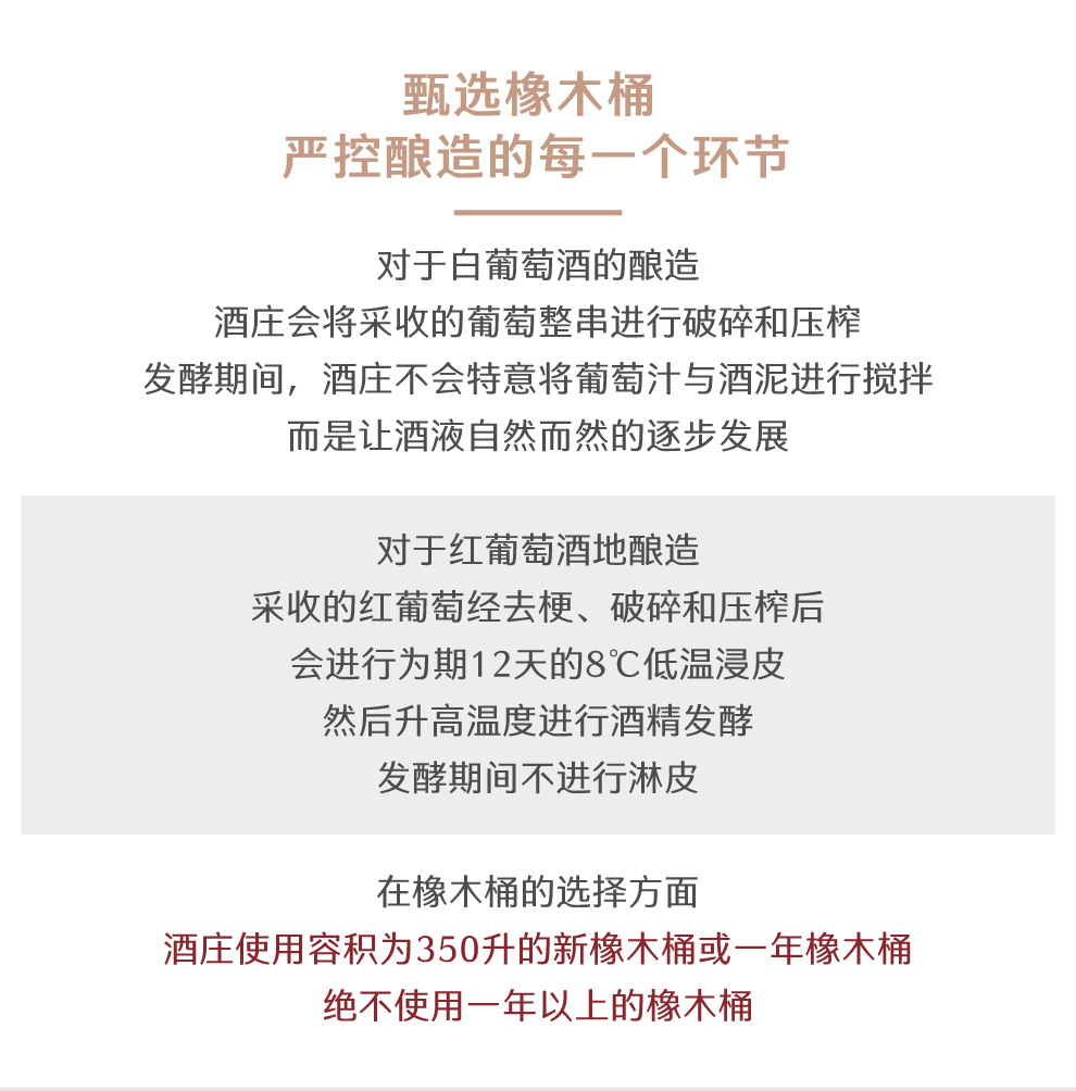 亨利布瓦洛酒庄在酿制白葡萄酒时会将采收的葡萄整串进行破碎和压榨,发酵期间,酒庄不会为了加速葡萄酒的成熟而特意将葡萄的汁液与酒泥进行搅拌。此外,采收的红葡萄经去梗、破碎和压榨后,会进行为期12天的8℃低温浸皮,然后升高温度进行酒精发酵,发酵期间不进行淋皮。葡萄酒熟成时,亨利布瓦洛酒庄使用容积为350升的新橡木桶或一年橡木桶,绝不使用一年以上的橡木桶。此外,酒庄出产的葡萄酒会在橡木桶中熟化18个月,之后在酒庄进行装瓶和包装。