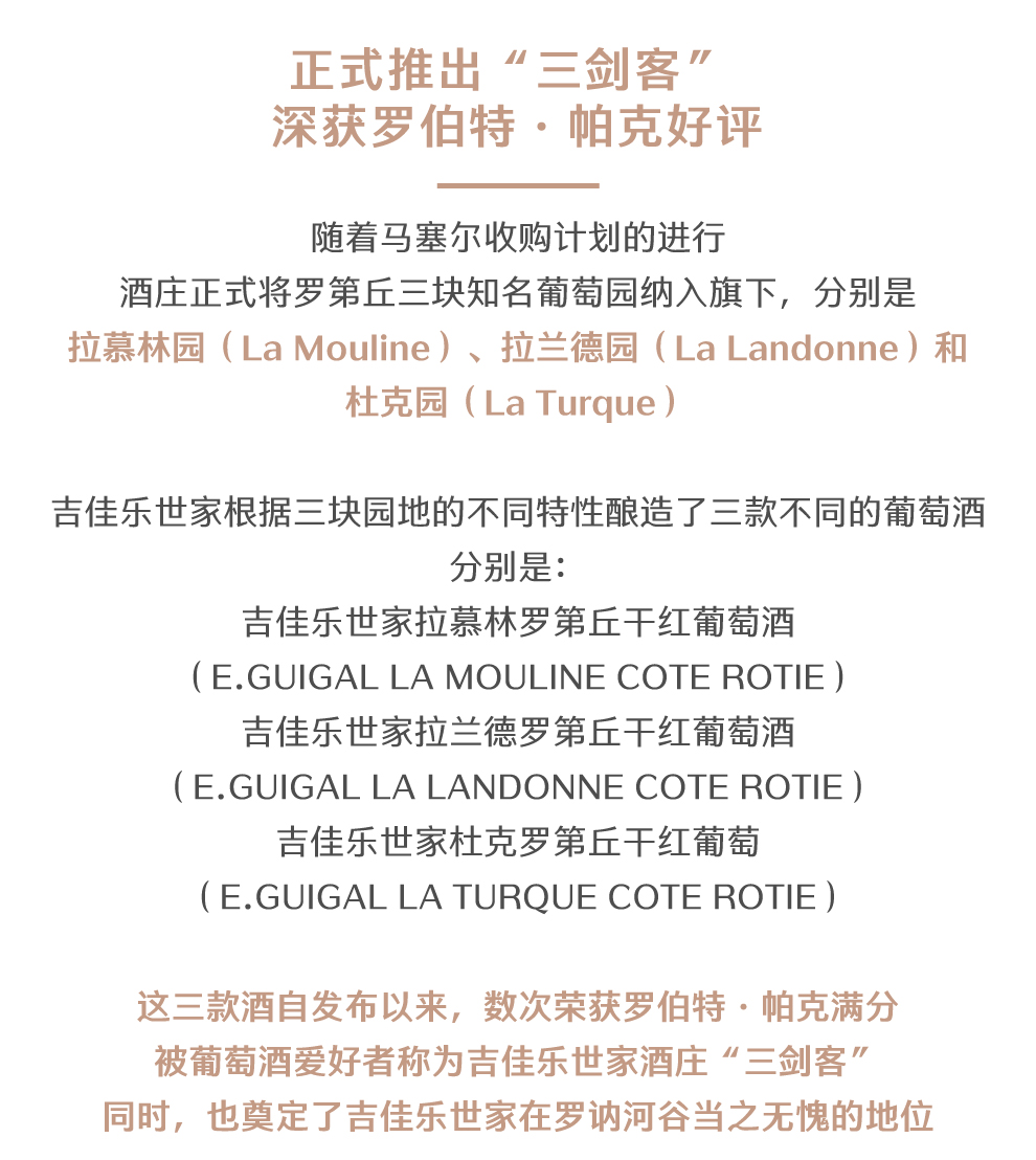 吉佳乐世家酒庄(E. Guigal)是罗第丘(Cote-Rotie)最富盛名,也是最重要的酒庄。1946年,艾蒂安•吉佳乐(Etienne Guigal)在罗第丘的酿酒中心阿布斯村(Ampuis)创建了该酒庄。阿布斯村历史悠久,其葡萄园已有超过2,400年的历史,至今仍保留着罗马时代的建筑物。1923年,14岁的艾蒂安•吉佳乐来到这里。他决定投身于酿酒业,一干就干了67年多。在1961年,年轻的马塞尔•吉佳乐(Marcel Guigal)接替了父亲管理酒庄。在马塞尔的努力下,吉佳乐世家酒庄开始收购一些知名的酒庄,实力不断提升。现在,该家族的第3代成员菲利普•吉佳乐(Philippe Guigal)担任着该酒庄的酿酒师,与伯尔纳德(Bernadette)、马塞尔(Marcel)一起构成酒庄的核心力量。