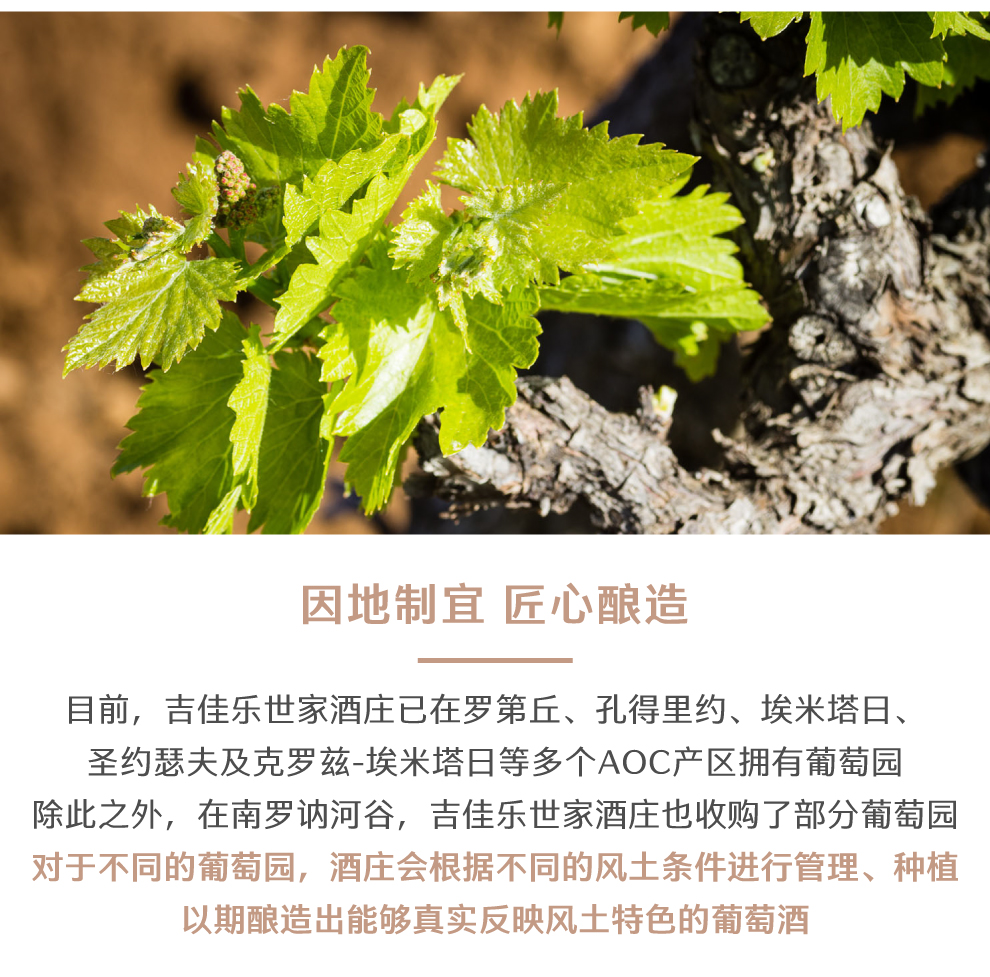 吉佳乐世家酒庄的酒窖至今仍位于阿布斯村,生产罗第、孔德里约(Condrieu)、埃米塔日(Hermitage)、圣约瑟夫(St.-Joseph)以及克罗兹-埃米塔日(Crozes- Hermitage)等多个AOC酒款,而该酒庄在罗讷河谷南部生产的教皇新堡(Chateauneuf-du-Pape)、吉恭达斯(Gigondas)、塔维勒(Tavel)和罗讷河谷丘(Cotes du Rhone)的酒款也会在这里陈年。吉佳乐世家酒庄的总部位于阿布斯堡(Chateau d’Ampuis)。这座城堡建于12世纪,周围围绕着大片的葡萄树,曾接待过多位法国君主,现在已经成为当地的名胜。
