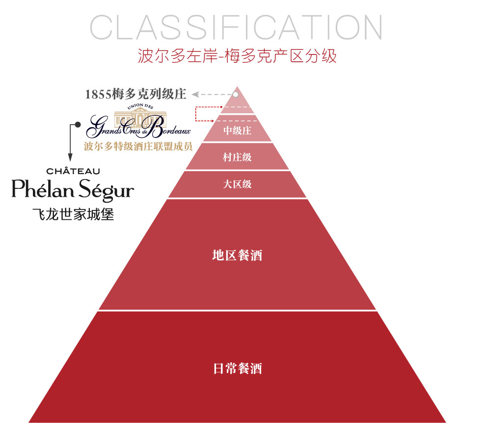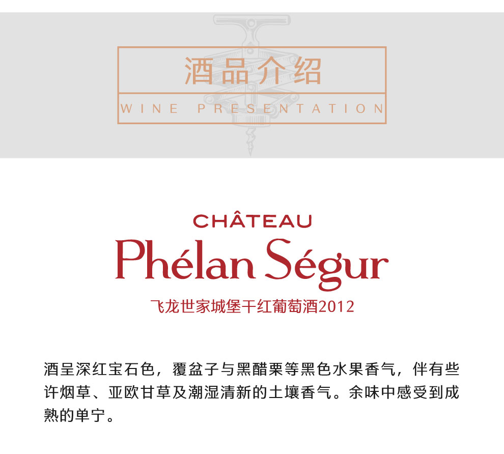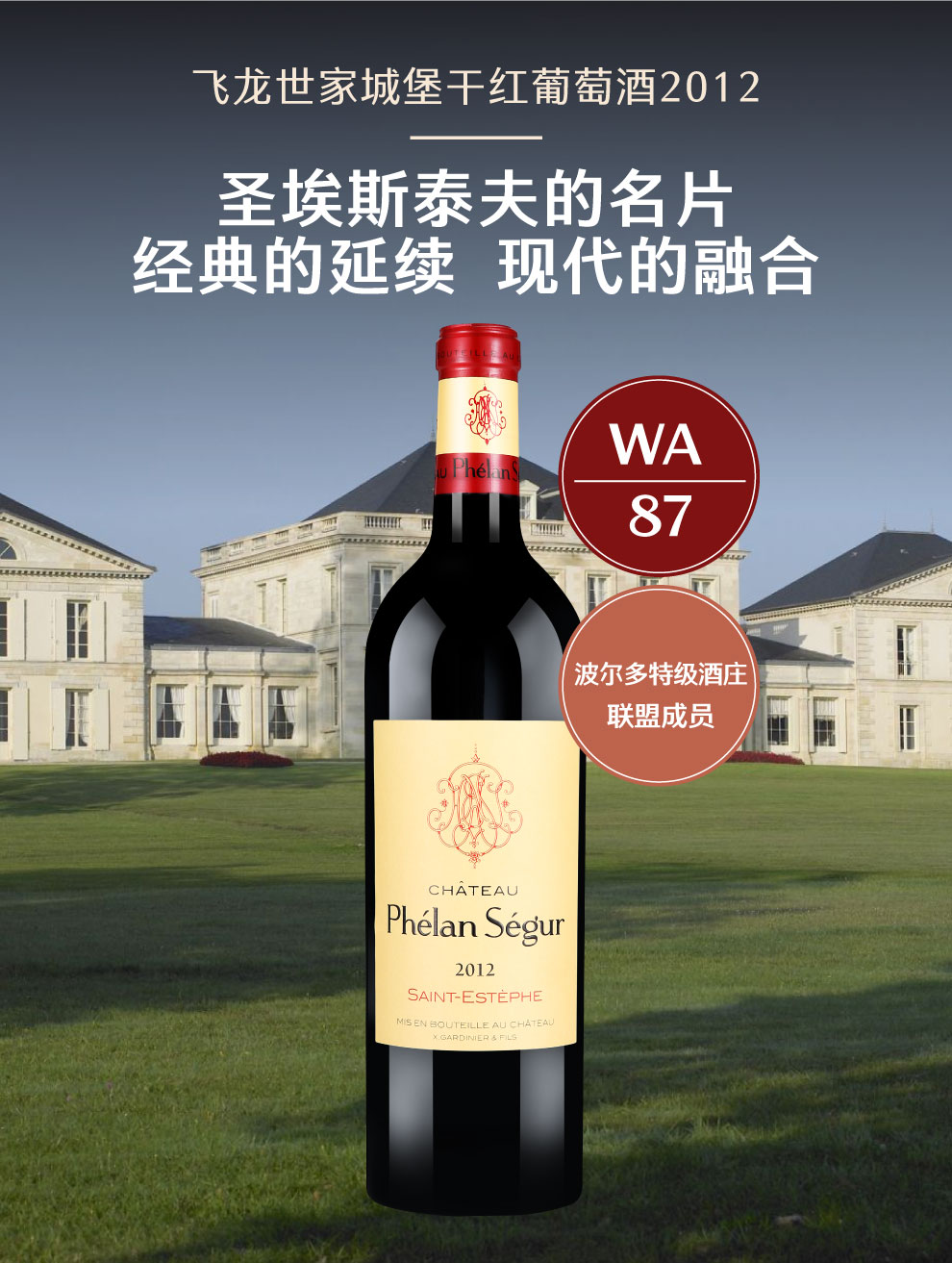 飞龙世家(Phelan Segur)酒庄获Robert Parker五星级酒庄的评级,远超过不少1855年的三、四、五级列级名庄的地位。2003年初,欧洲最权威的葡萄酒杂志Decanter评出全世界范围内最超值的五十大名酒中,飞龙世家榜上有名。飞龙世家的酒性正如她们的主人一样:大方、开扬、和顺、自然、平易近人。她中度酒体,单宁平和,木香丰富而且饱满,既可年轻饮用,又可陈放二十年(好年份可更长)。
