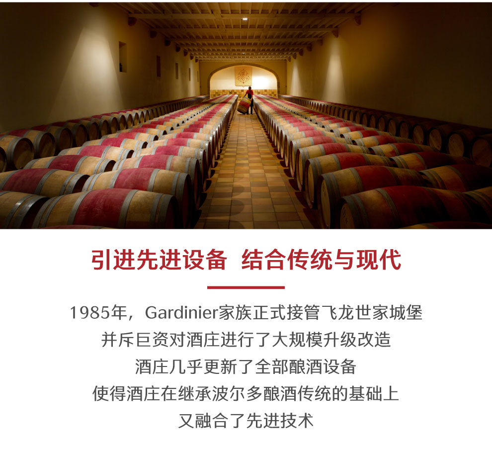 飞龙世家酒庄,堪称潜力无限,不仅在国际上声名显赫,而且深得酒评届的多次肯定。能得到这样的殊荣,与飞龙世家对其佳酿的严格把关和致力于葡萄酒行与所作出的贡献密不可分。自从1985年Gardinier家族接受该酒庄后,不仅花重金进行了大规模的投资,更新了几乎全部设备,使其达到了世界最先进的标准;而且以十分认真严谨的态度来管理酒庄,保证了飞龙世家产品的高水准。通过Gardinier父子这近二十年的努力,酒庄无论从设备到葡萄的种植管理都始终在最一流的水平。