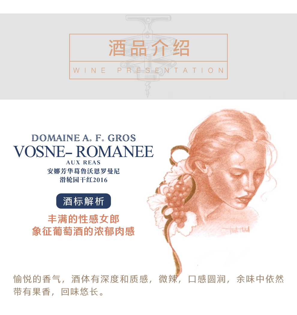 安娜芳华葛鲁酒庄(Domaine A. F. Gros)位于法国勃艮第(Burgundy)伯恩丘(Cote de Beaune)产区,是该产区内一座精品酒庄。AF酒庄的前身是让·葛鲁(Jean Gros)和珍妮·葛鲁(Jeanine Gros)夫妇共同创建的葛鲁-雷诺多(Gros-Renaudot)酒庄。