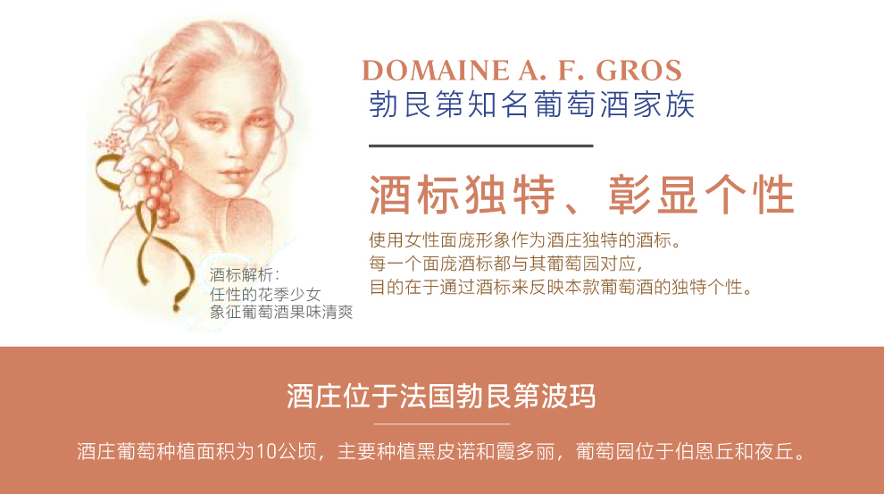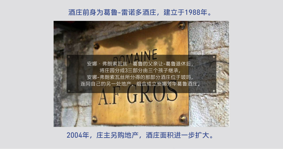 安娜芳华葛鲁酒庄(Domaine A. F. Gros)位于法国勃艮第(Burgundy)伯恩丘(Cote de Beaune)产区,是该产区内一座精品酒庄。AF酒庄的前身是让·葛鲁(Jean Gros)和珍妮·葛鲁(Jeanine Gros)夫妇共同创建的葛鲁-雷诺多(Gros-Renaudot)酒庄。