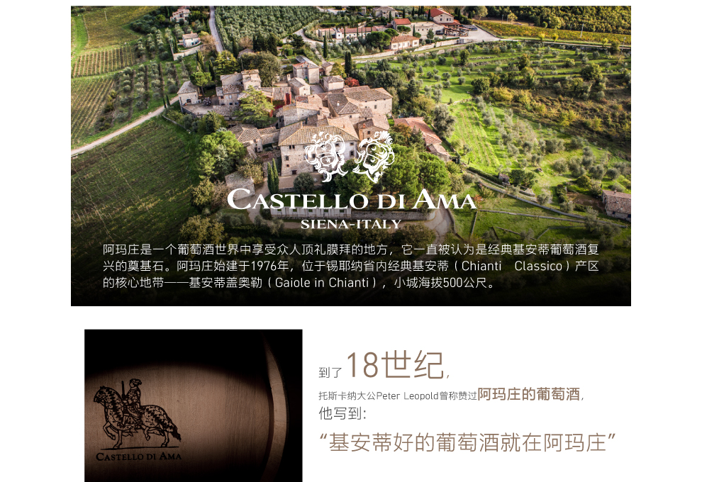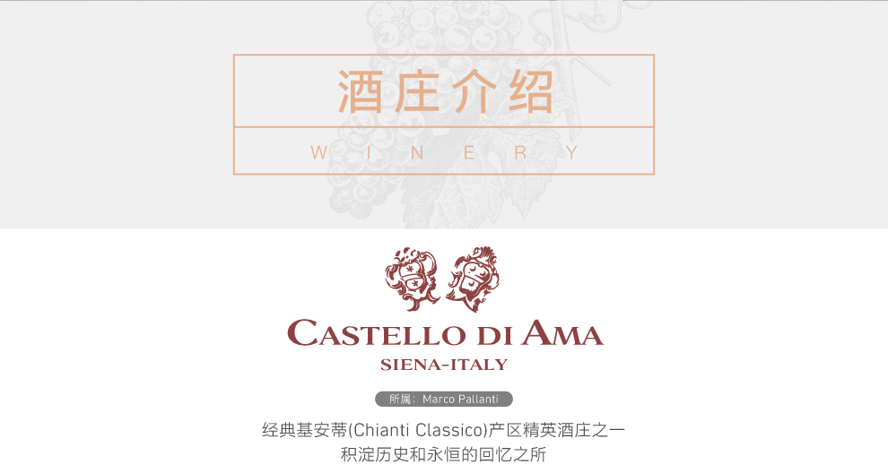 Castello di Ama是一个葡萄酒世界中享受众人顶礼膜拜的地方。意大利人常常抱怨说他们没有玛歌庄,没有罗曼尼康迪,没有Opus One。但是在意大利,有一些超越普通酒庄的“城堡”。那是接近完美的酒神之域,积淀了历史和永恒的回忆之所。Castello di Ama就是这样一个邂逅柏拉图式的美好纯粹的地方。