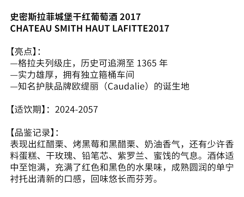 5. 因酒庄陈酿、装瓶及发货时间各不相同,2024年份新酒预计在2027年初至2027年末陆续到货,2023年份新酒预计在2026年初至2026年末陆续到货,2022年份新酒预计在2025年初至2025年末陆续到货,2021年份新酒预计在2024年初至2024年末陆续到货,其他年份酒品到货时间详见酒品购买页面标注。