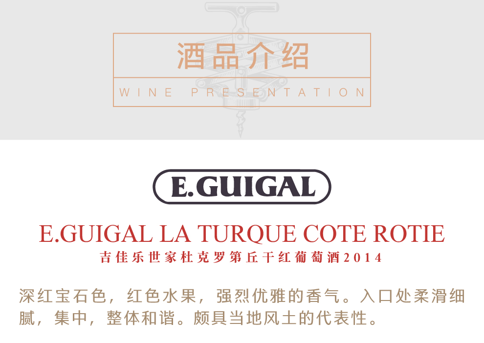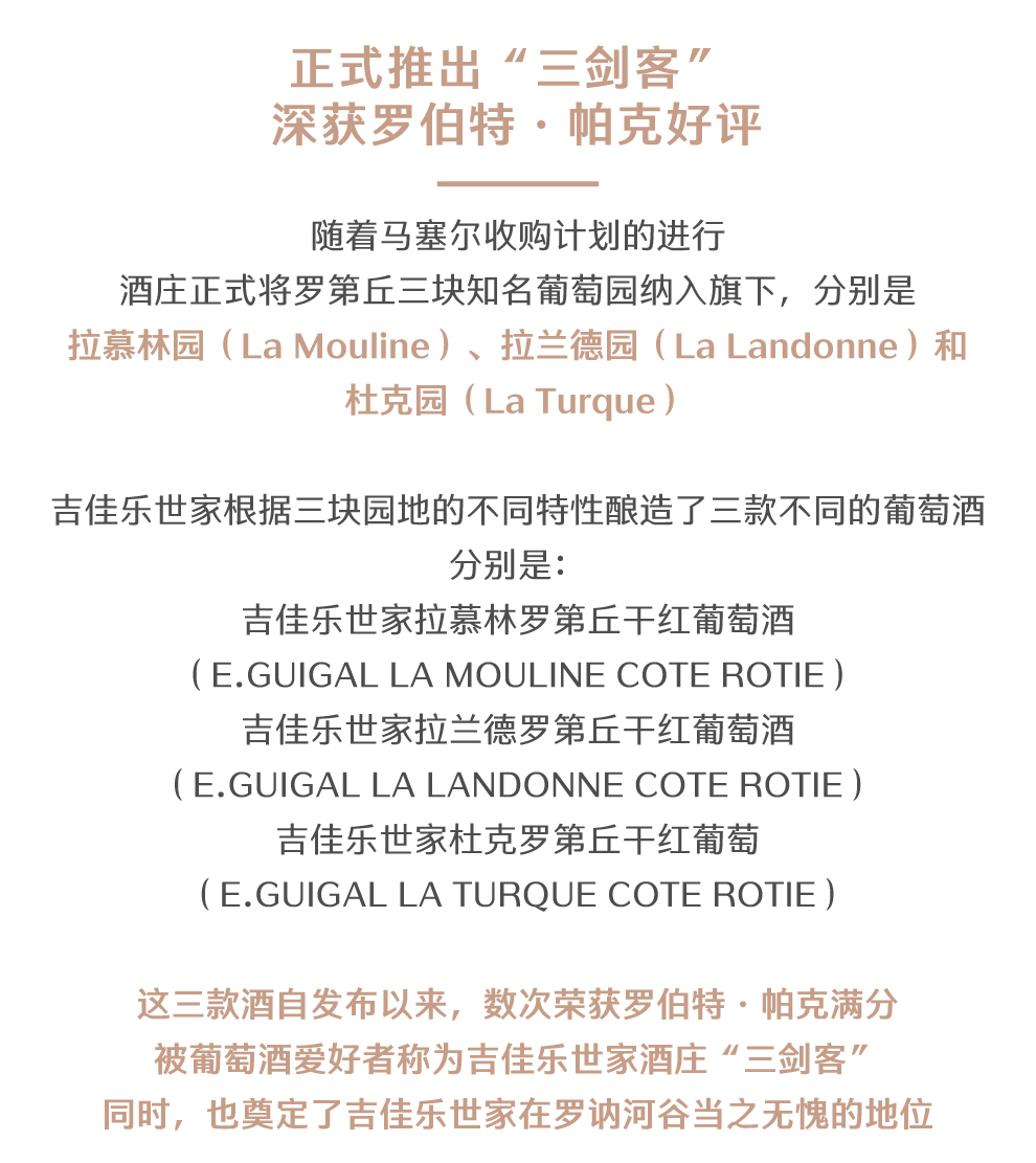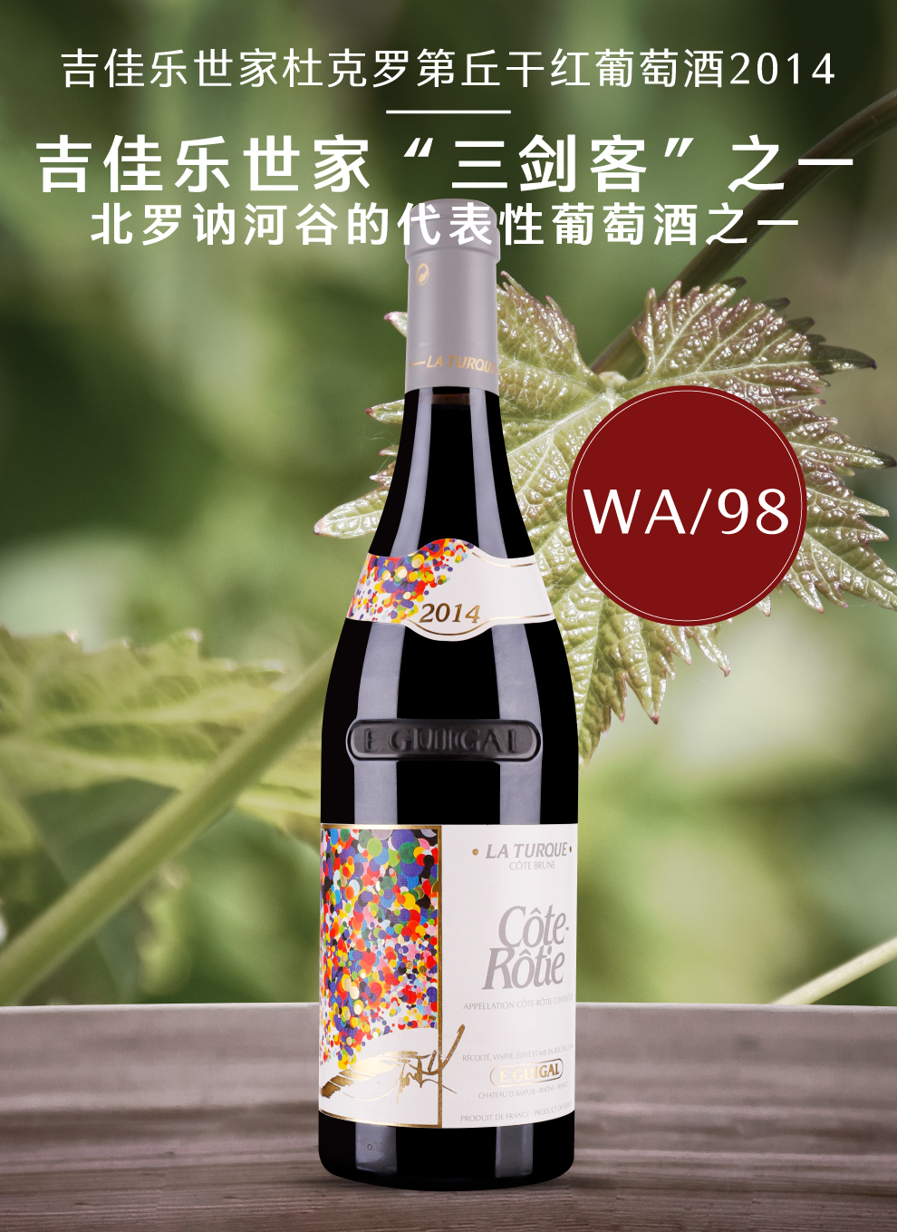 吉佳乐世家酒庄(E. Guigal)是罗第丘(Cote-Rotie)最富盛名,也是最重要的酒庄。1946年,艾蒂安•吉佳乐(Etienne Guigal)在罗第丘的酿酒中心阿布斯村(Ampuis)创建了该酒庄。阿布斯村历史悠久,其葡萄园已有超过2,400年的历史,至今仍保留着罗马时代的建筑物。1923年,14岁的艾蒂安•吉佳乐来到这里。他决定投身于酿酒业,一干就干了67年多。在1961年,年轻的马塞尔•吉佳乐(Marcel Guigal)接替了父亲管理酒庄。在马塞尔的努力下,吉佳乐世家酒庄开始收购一些知名的酒庄,实力不断提升。现在,该家族的第3代成员菲利普•吉佳乐(Philippe Guigal)担任着该酒庄的酿酒师,与伯尔纳德(Bernadette)、马塞尔(Marcel)一起构成酒庄的核心力量。