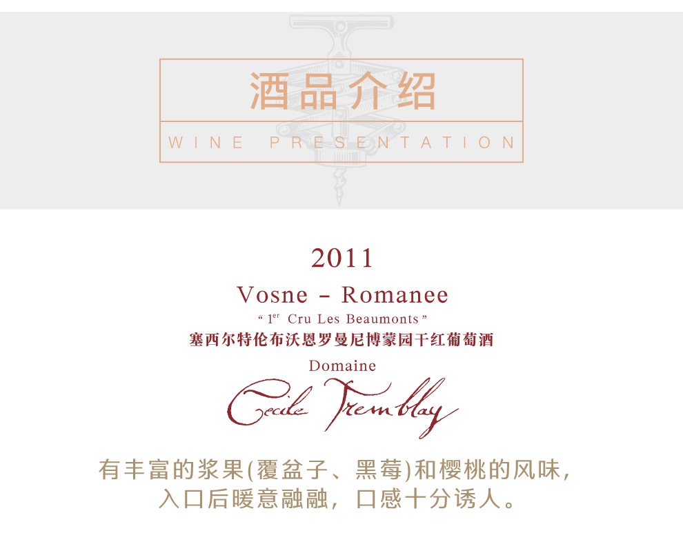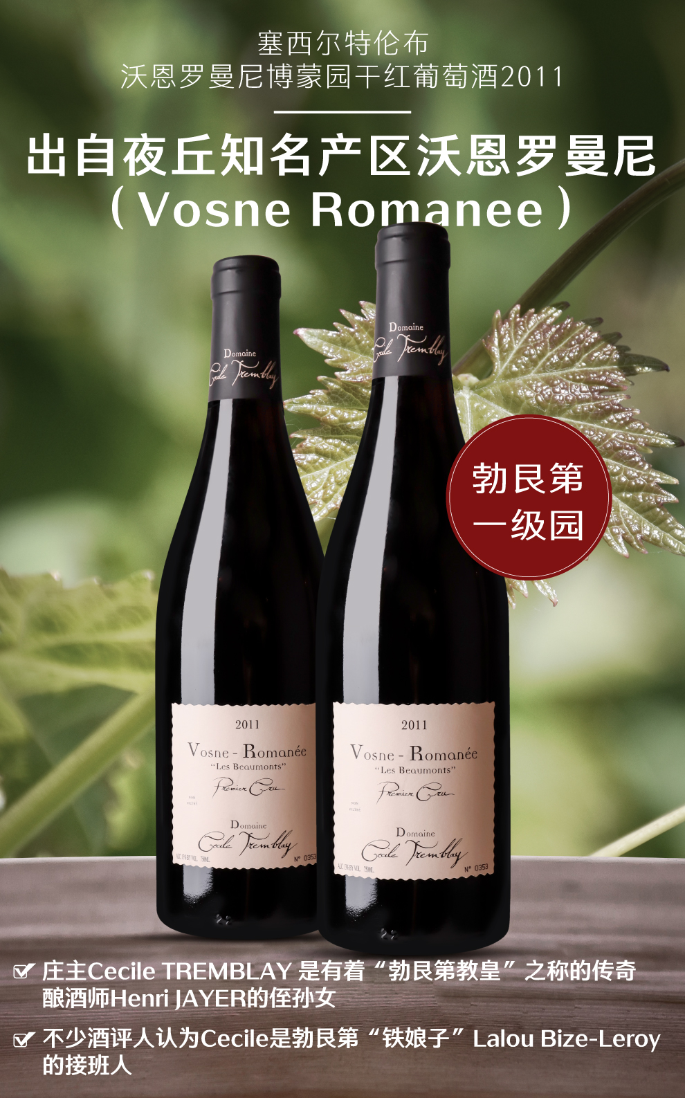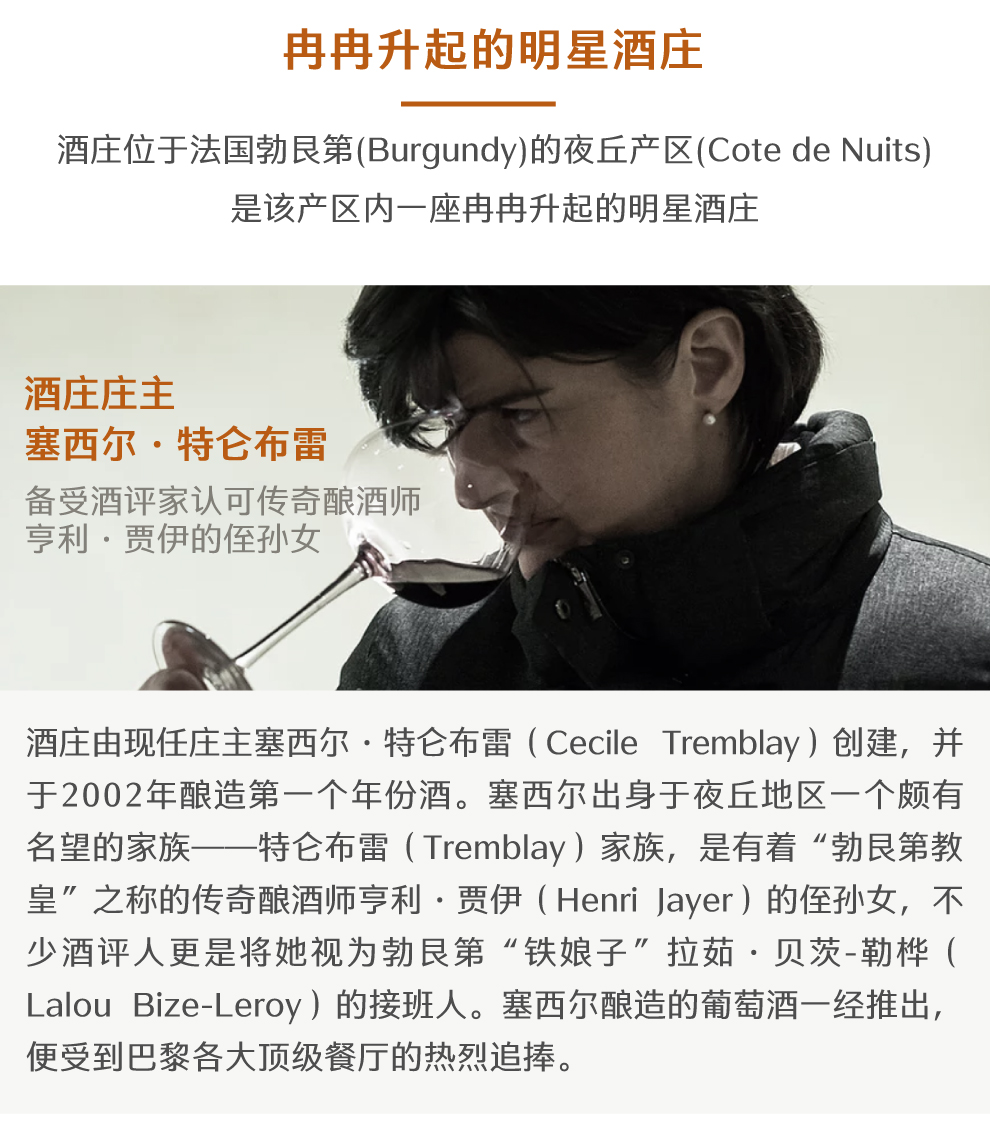 塞西尔特仑布雷酒庄由现任庄主塞西尔·特仑布雷(Cecile Tremblay)创建,并于2002年酿造第一个年份酒。塞西尔出身于夜丘地区一个颇有名望的家族——特仑布雷(Tremblay)家族,是有着“勃艮第教皇”之称的传奇酿酒师亨利·贾伊(Henri Jayer)的侄孙女。事实上,特仑布雷家族投资葡萄种植行业已有几代人之久,在夜丘拥有十分出色的葡萄园,但塞西尔却是家族中从事葡萄种植的第一人。2003年,塞西尔从承租人手中收回葡萄园的经营权,开始亲自打理。塞西尔凭借过人的天赋和努力赢得了外界的广泛认可,她酿造的葡萄酒一经推出,便受到巴黎各大顶级餐厅的热烈追捧,而不少酒评人更是将她视为勃艮第“铁娘子”拉茹·贝茨-勒桦(Lalou Bize-Leroy)的接班人。