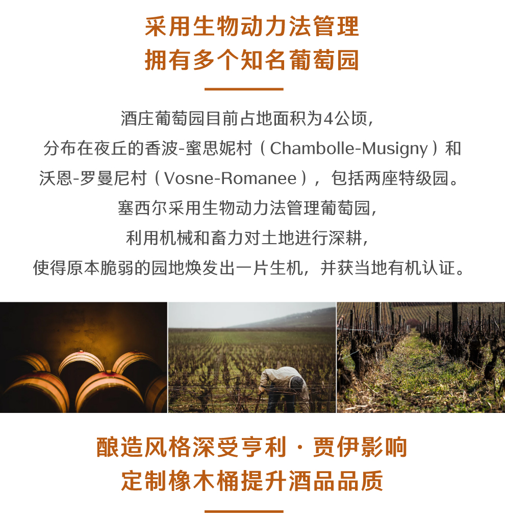 塞西尔特仑布雷酒庄葡萄园的占地面积总共为4公顷,分布在夜丘的香波-慕西尼村(Chambolle-Musigny)和沃恩-罗曼尼村(Vosne-Romanee)。其中,特级园有两座,分别是夏贝尔-香贝丹园(Chapelle-Chambertin)和大依瑟索特级园(Les Grands Echezeaux)的略地(Lieu Dit)——德苏(Dessus)特级田,前者面积为0.4公顷,园内葡萄树的平均树龄为50年,后者风土条件优渥,葡萄树的平均树龄为40年,是依瑟索园内最出色的地块之一。此外,酒庄还拥有一些优质的一级葡萄园,诸如德苏-红园(Les Rouges du Dessus)、秀山园(Les Beaux Monts)等。秀山园内种植着葡萄树平均树龄达75年,其出产的葡萄酒香气芬芳馥郁,结构强劲有力。