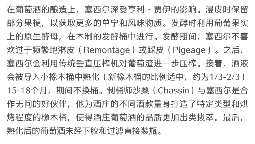 在葡萄酒的酿造上,塞西尔深受亨利·贾伊的影响。浸皮时保留部分果梗,以获取更多的单宁和风味物质。发酵时利用葡萄果实上的原生酵母,在木制的发酵桶中进行。发酵期间,塞西尔不喜欢过于频繁地淋皮(Remontage)或踩皮(Pigeage)。之后,塞西尔会利用她钟爱的传统垂直压榨机对葡萄渣进一步压榨。接着,酒液会被导入小橡木桶中熟化(新橡木桶的比例适中,约为1/3-2/3)15-18个月,期间不换桶。制桶师沙桑(Chassin)与塞西尔是合作无间的好伙伴,他为酒庄的不同酒款量身打造了特定类型和烘烤程度的橡木桶,使得酒庄葡萄酒的品质更加出类拔萃。最后,熟化后的葡萄酒未经下胶和过滤直接装瓶。