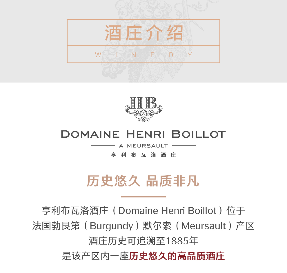 亨利布瓦洛酒庄的历史最早可以追溯到1885年。从那时起,亨利布瓦洛家族就已经开始种植葡萄树并酿酒了。布瓦洛酒庄原名是“Domaine Jean Boillot”,根据亨利布瓦洛家族第四代传人让·布瓦洛(Jean Boillot)的名字命名。2005年,让·布瓦洛的儿子亨利·布瓦洛(Henry Boillot)将其他兄妹名下的产业股权买了下来,并将这些产业重新整合为一个酒庄,最后改名为“Domaine Henri Boillot”。酒庄目前的庄主亨利·布瓦洛是布瓦洛家族的第五代传人。近几年,他的儿子吉月莫(Guillaume)也加入到酒庄的经营中来。