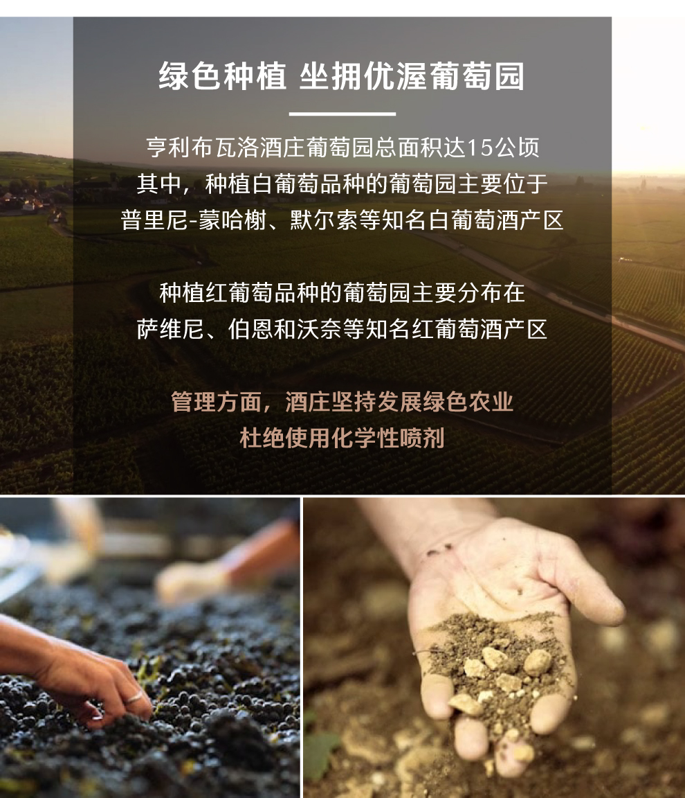 亨利布瓦洛酒庄葡萄园的总面积为15公顷,其中,种植白葡萄品种的葡萄园主要位于普里尼-蒙哈榭(Puligny-Montrachet)产区的穆谢尔园(Clos de la Mouchere),面积约为3.92公顷;种植红葡萄品种的葡萄园主要分布在萨维尼(Savigny)、伯恩 (Beaune)和沃尔奈(Volnay)等地区。布瓦洛酒庄在葡萄园的管理上坚持发展绿色农业,杜绝使用化学性喷剂。