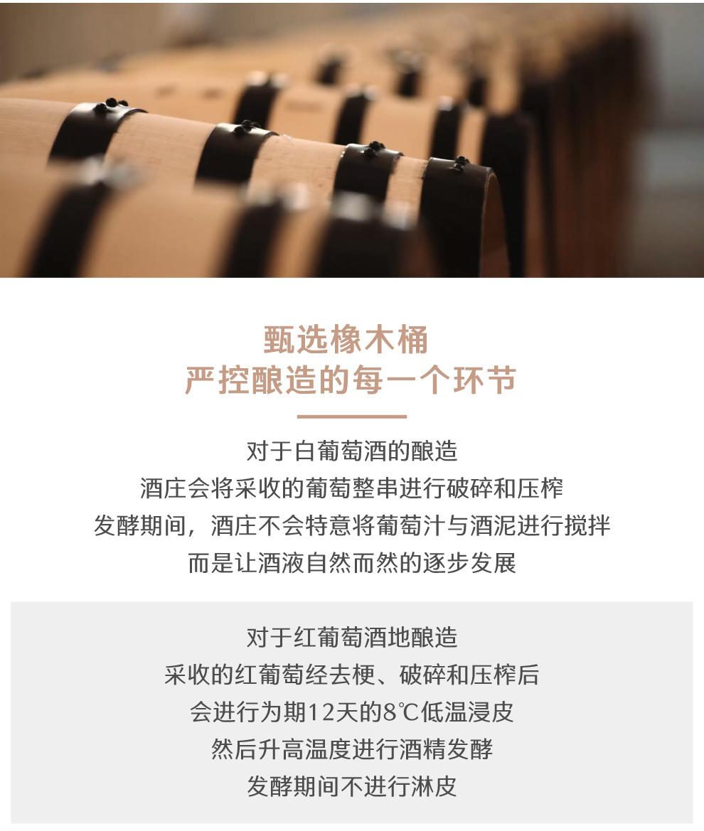 亨利布瓦洛酒庄在酿制白葡萄酒时会将采收的葡萄整串进行破碎和压榨,发酵期间,酒庄不会为了加速葡萄酒的成熟而特意将葡萄的汁液与酒泥进行搅拌。此外,采收的红葡萄经去梗、破碎和压榨后,会进行为期12天的8℃低温浸皮,然后升高温度进行酒精发酵,发酵期间不进行淋皮。葡萄酒熟成时,亨利布瓦洛酒庄使用容积为350升的新橡木桶或一年橡木桶,绝不使用一年以上的橡木桶。此外,酒庄出产的葡萄酒会在橡木桶中熟化18个月,之后在酒庄进行装瓶和包装。