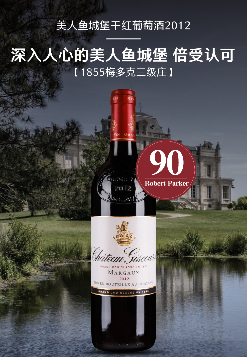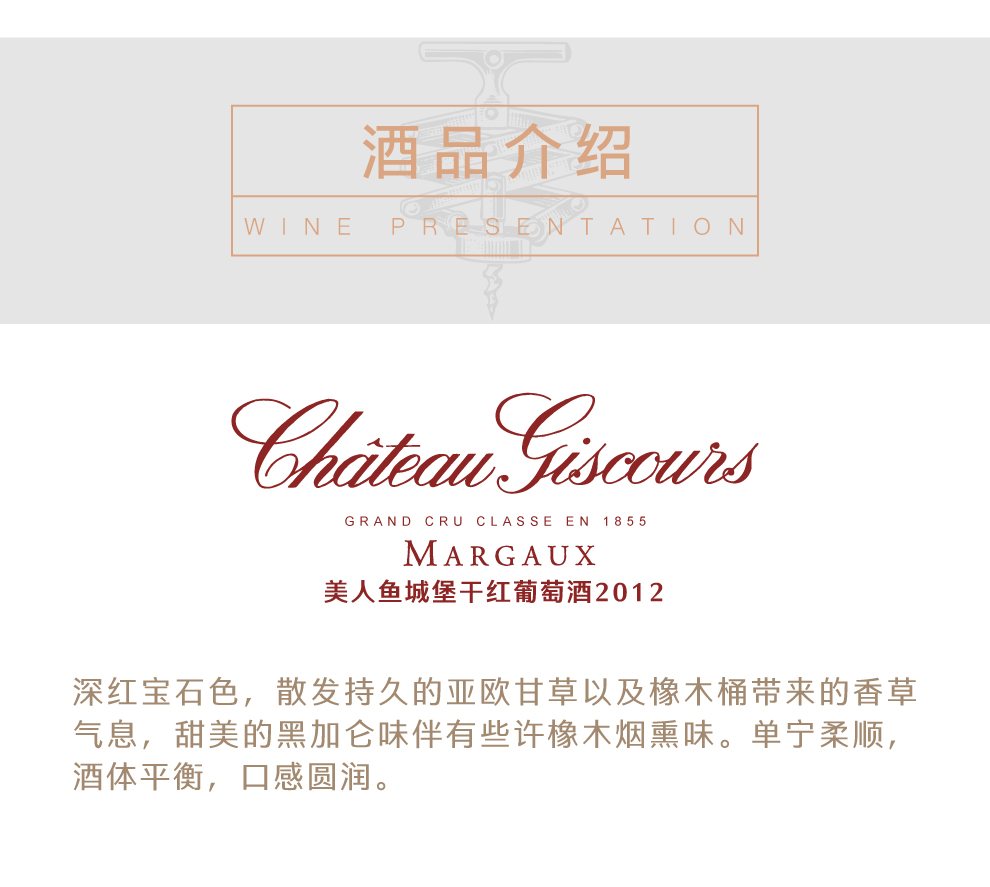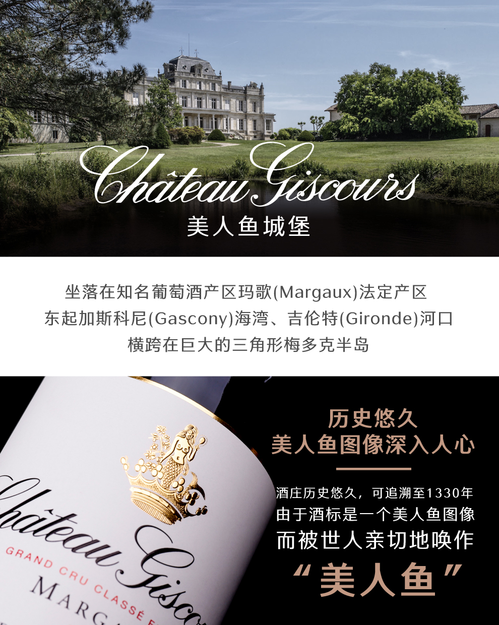 美人鱼城堡(Chateau Giscours)在1855年梅多克评级中被评为三级酒庄,因酒庄的酒标是一个美人鱼图像而被世人亲切地唤作“美人鱼”。美人鱼城堡坐落在世界顶级葡萄酒产区玛歌(Margaux),是梅多克产区最大的酒庄之一,也是波尔多产区最大的酒庄之一,距离波尔多西北部20公里,东起加斯科尼(Gascony)海湾、吉伦特(Gironde)河口,横跨在巨大的三角形梅多克半岛。