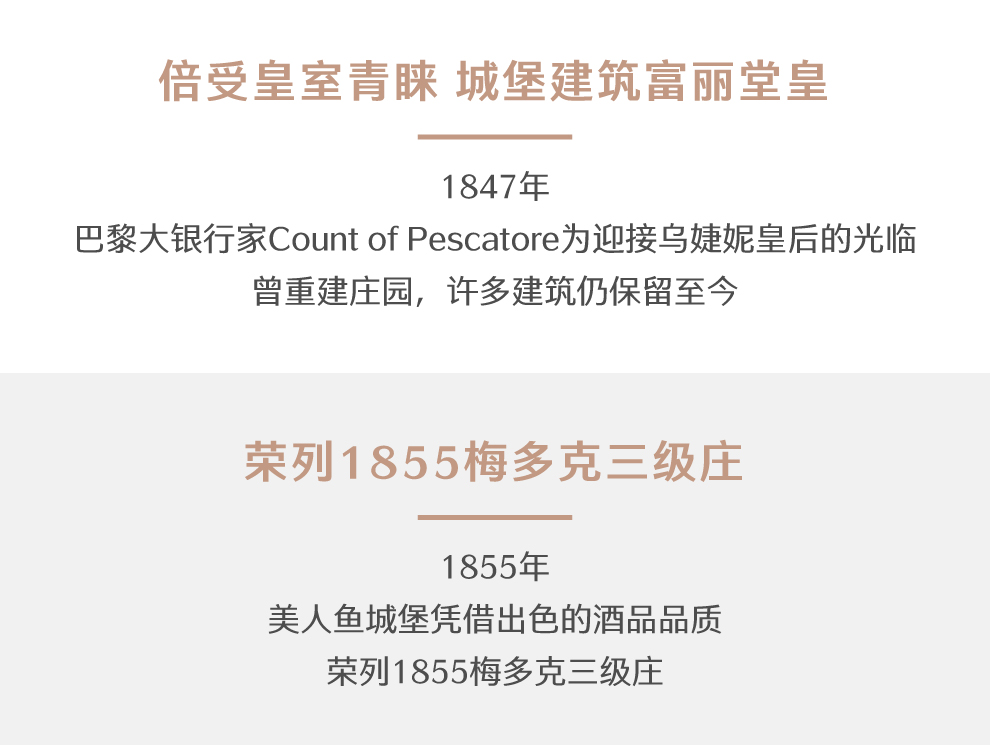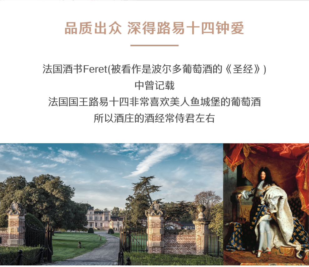 美人鱼城堡是一家历史悠久的酒庄,最早可追溯至1330年。两个世纪后的1552年,该酒庄以1,000英镑的价格卖给了皮埃尔•罗姆(Pierre L‘Homme)。在出售文书上,美人鱼酒庄已标明为一个葡萄园。法国酒书Feret(被看作是波尔多葡萄酒的《圣经》)中曾记载,路易XIV国王非常喜欢美人鱼酒庄的葡萄酒,所以酒庄的酒常侍君左右。又过了两个世纪,酒庄为圣西门(Saint-Simon)家族所有,不过没多久,1789年法国大革命时期酒庄没能逃脱被没收充公的命运。随后酒庄曾多次易主,庄主之一,巴黎大银行家Count of Pescatore为迎接乌婕妮皇后的光临,曾于1847年重建庄园,许多建筑仍保留至今。