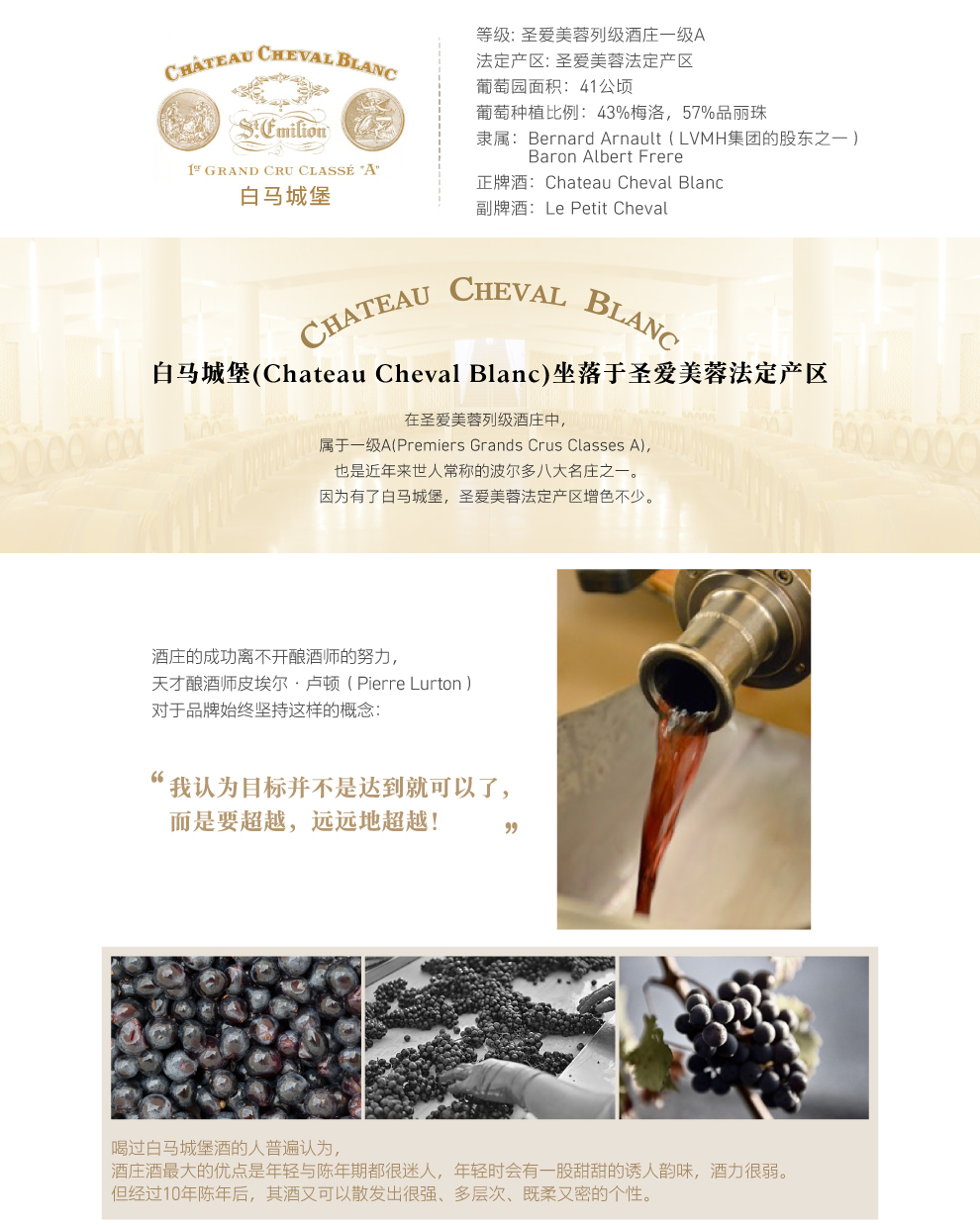 白马庄园(Chateau Cheval Blanc)坐落于圣爱美容法定产区。在圣爱美容列级酒庄中,属于一级特等酒庄A级(Premiers Grands Crus Classes A),也是近年来世人常称的波尔多八大名庄之一。因为有了白马庄园,圣爱美容法定产区增色不少。