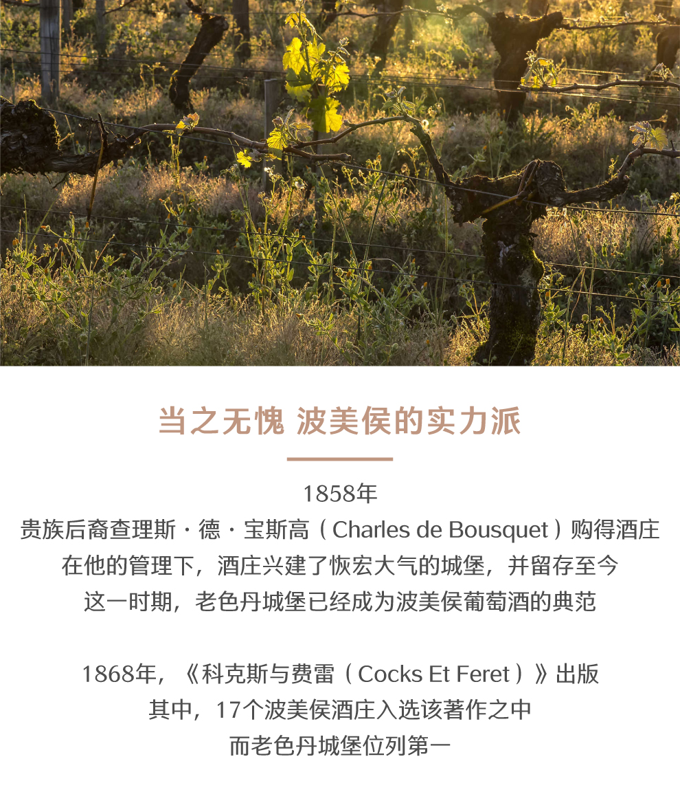 1858年,贵族后裔查理斯·德·宝斯高(Charles de Bousquet)购得酒庄。矗立在老色丹酒庄中的城堡,就是那个时候建造的。在他的精心经营之下,老色丹城堡成为波美侯产区葡萄酒的典范。1853年出版的法国酒书中,老色丹城堡是本区唯一被记录的酒庄。1868年版的科克斯&费雷《Cocks Et Feret》中,有17个被列入的波美侯酒庄,而老色丹城堡位列第一的位置。