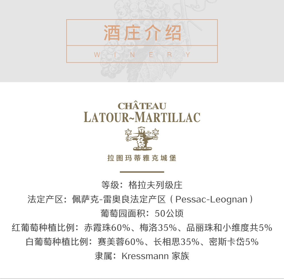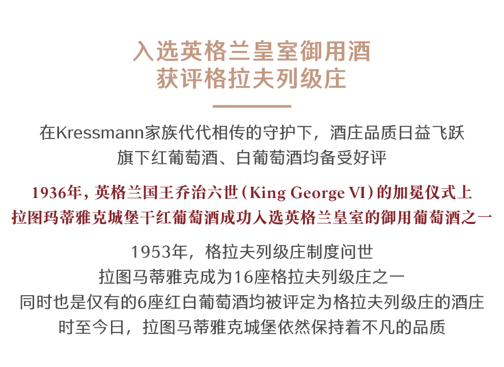 经过克莱斯曼家族几代人的不懈努力,在1953年格拉夫分级评定中,拉图玛蒂雅克酒庄终于出现在佩萨克-雷奥良产区列级酒庄名录中。