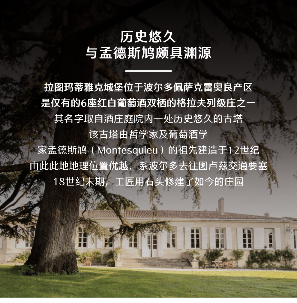 拉图玛蒂雅克酒庄,其名字源自酒庄庭院内一处历史悠久的古塔,该古塔是一座城堡的遗迹,12世纪时,伟大的哲学家兼葡萄酒学家孟德斯鸠的祖先建造了它。此地地理位置优越,系波尔多去往图卢兹交通要塞,战略位置突出。18世纪末期,工匠用石头修建了如今的庄园。
