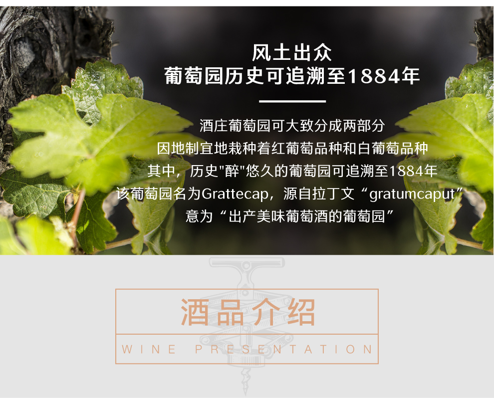 拉图玛蒂雅克酒庄里历史最悠久的葡萄园区可追溯至1884年。该葡萄园名为Grattecap,源自拉丁文“gratumcaput”,意为“出产美味葡萄酒的葡萄园”。位于酒庄东南角,占地65英亩,是拉图玛蒂雅克酒庄的传统园区,主要种植赛芙蓉,也种植长相思以及密斯卡岱。该园区采用纯手工传统种植方式,甚至驱马耕作。