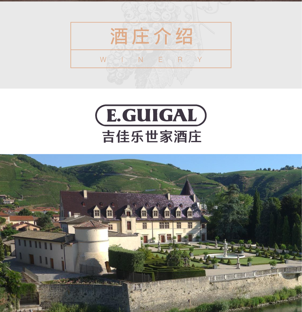 吉佳乐世家酒庄(E. Guigal)是罗第丘(Cote-Rotie)最富盛名,也是最重要的酒庄。1946年,艾蒂安•吉佳乐(Etienne Guigal)在罗第丘的酿酒中心阿布斯村(Ampuis)创建了该酒庄。阿布斯村历史悠久,其葡萄园已有超过2,400年的历史,至今仍保留着罗马时代的建筑物。1923年,14岁的艾蒂安•吉佳乐来到这里。他决定投身于酿酒业,一干就干了67年多。在1961年,年轻的马塞尔•吉佳乐(Marcel Guigal)接替了父亲管理酒庄。在马塞尔的努力下,吉佳乐世家酒庄开始收购一些知名的酒庄,实力不断提升。现在,该家族的第3代成员菲利普•吉佳乐(Philippe Guigal)担任着该酒庄的酿酒师,与伯尔纳德(Bernadette)、马塞尔(Marcel)一起构成酒庄的核心力量。