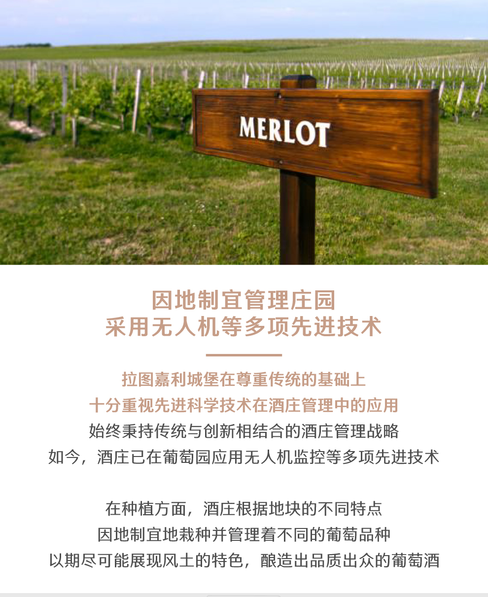 拉图嘉利于1999年被大名鼎鼎的酒商BernardMagrez贝尔纳.马格雷买下,更为严格的针对拉图嘉利土壤土质多样性的分块管理从此展开。尊重环境放弃除草和土壤改良,把重心放在提高作物潜能的种植酿酒哲学,保住了拉图嘉利名酒的声誉,更是将传统的方法和现代技术优化结合,精细灵活与差异性并存,毫无疑问地将拉图嘉利的盛名远播在外。10年后的2009年份拉图嘉利更是达到一个里程碑高峰。