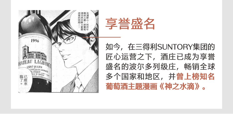 1983年,日本三得利(Suntory)老板怀着拥有波尔多列级名庄的梦想,与法国政府缠斗2年多后,终于在这一年以千万美金接手拉格喜庄园,成为第一个踏进法国文化财产禁区——波尔多列级名庄的亚洲企业。这也成为当时轰动整个梅多克甚至法国的大事件,因为在这之前,把酒庄卖给亚洲人,这在整个法国的酒庄是想都不敢想的。
