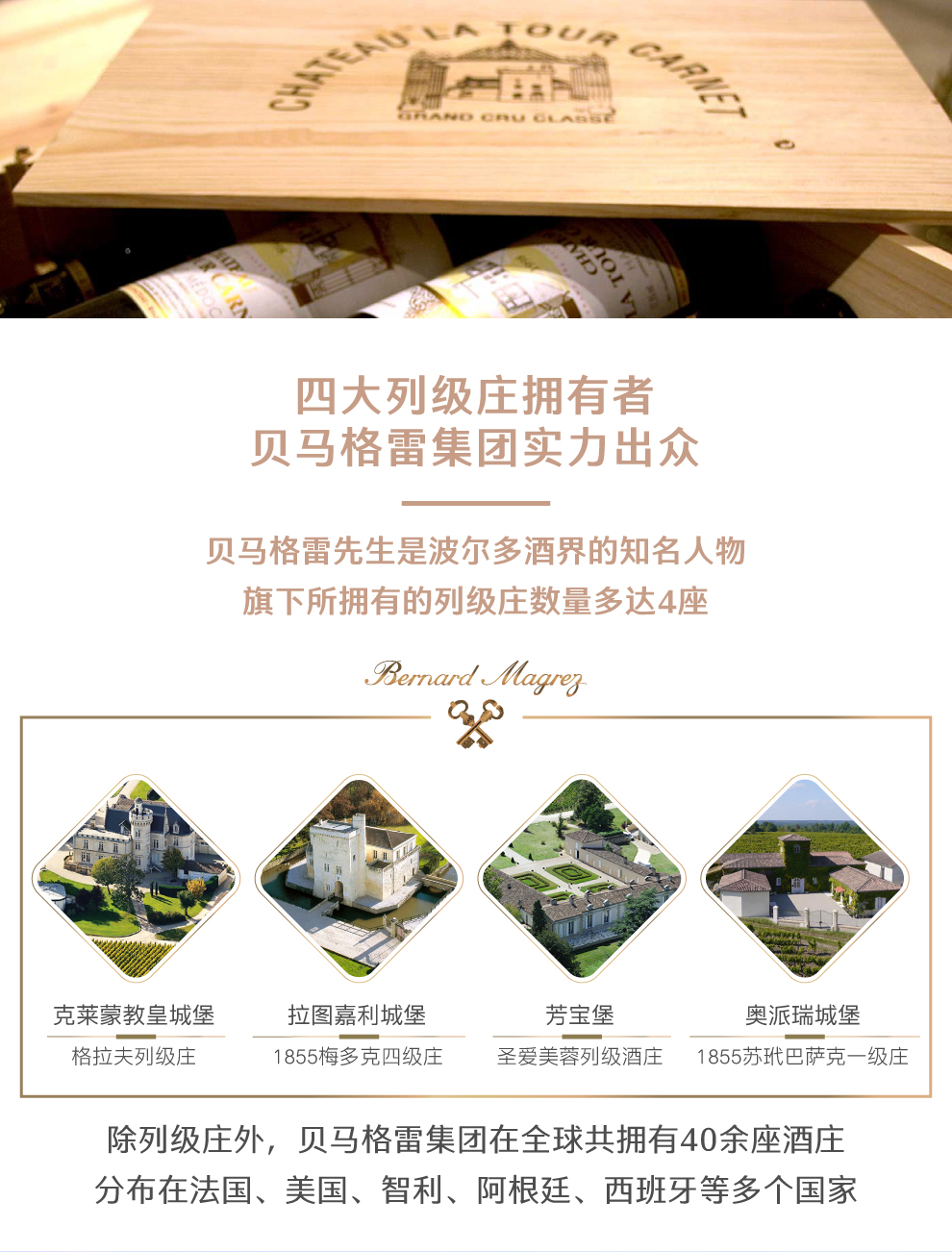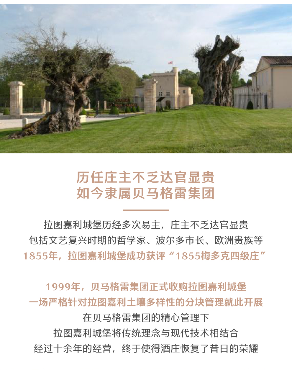 拉图嘉利于1999年被大名鼎鼎的酒商BernardMagrez贝尔纳.马格雷买下,更为严格的针对拉图嘉利土壤土质多样性的分块管理从此展开。尊重环境放弃除草和土壤改良,把重心放在提高作物潜能的种植酿酒哲学,保住了拉图嘉利名酒的声誉,更是将传统的方法和现代技术优化结合,精细灵活与差异性并存,毫无疑问地将拉图嘉利的盛名远播在外。10年后的2009年份拉图嘉利更是达到一个里程碑高峰。