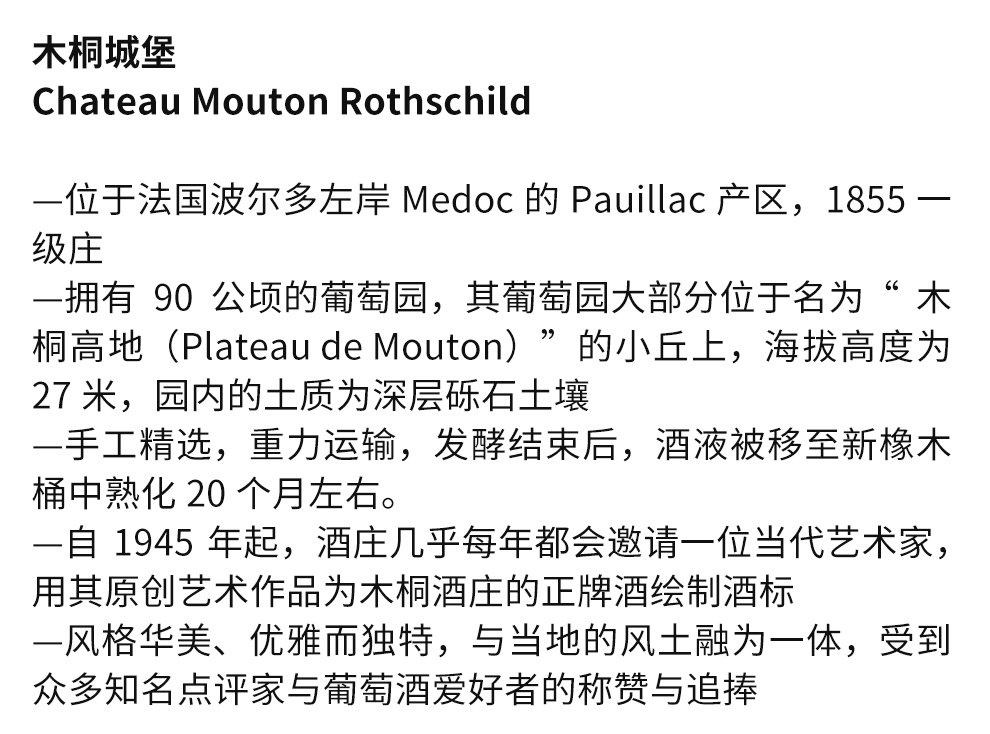 这些酒标囊括了印象派、抽象派、立体主义、表现主义、超现实主义、波普艺术以及涂鸦艺术等20世纪以来最重要的艺术流派,由此增加了趣味性和可藏性。在红酒爱好者心中,这一特色也让木桐成为五大酒庄中特例独行的艺术品牌。