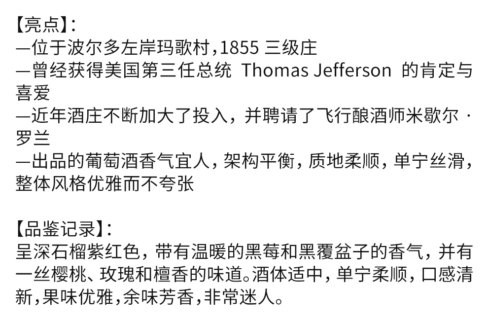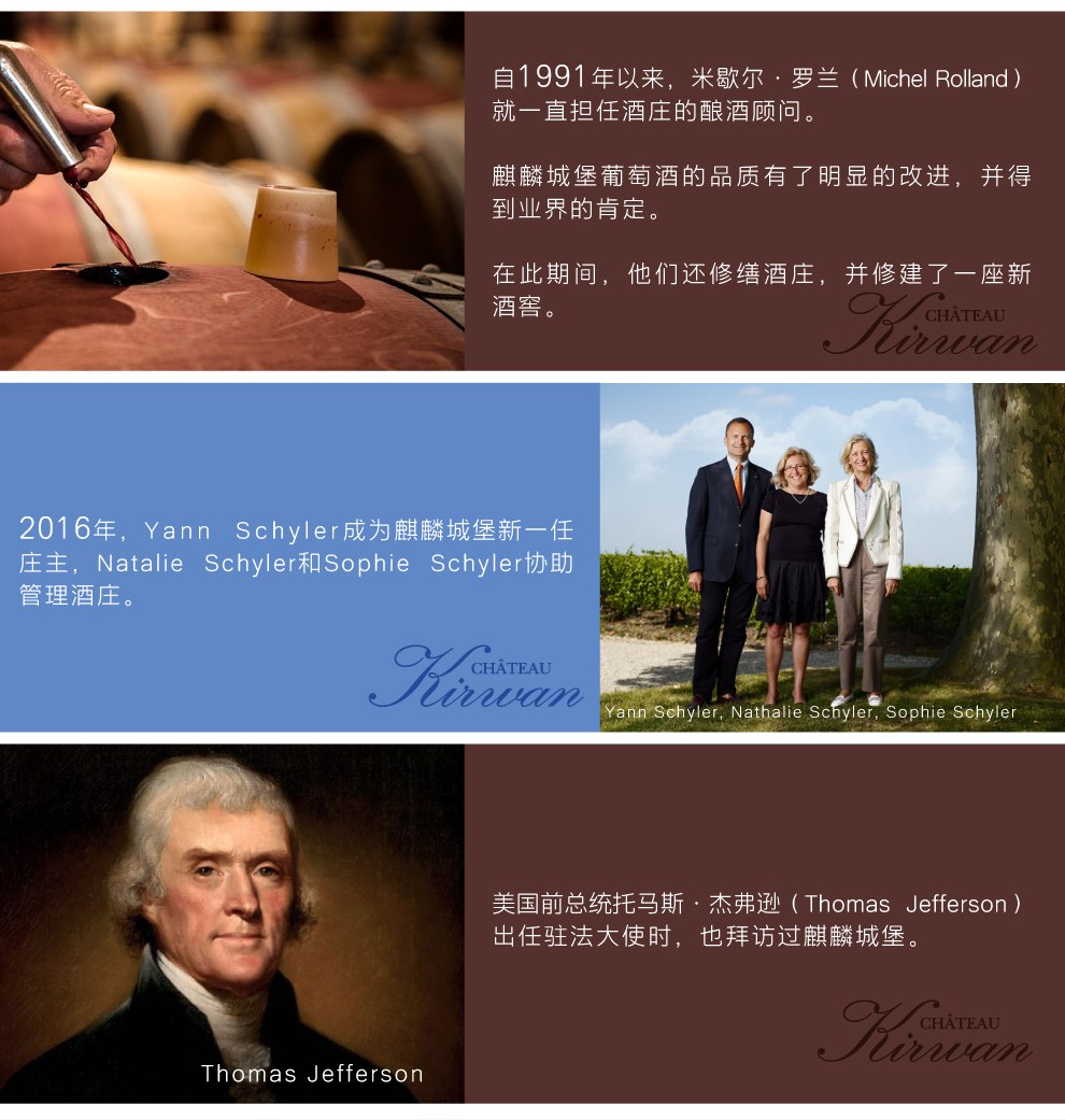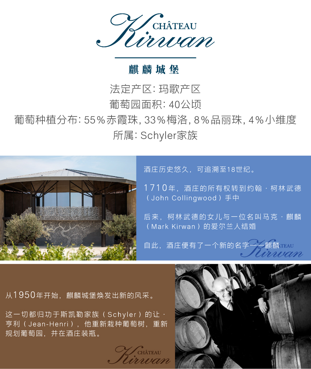 麒麟酒庄(Chateau Kirwan) 的名字可追溯至18世纪,它原属于一位名叫利纳德•赛尔(Renard de la Salle)的波尔多贵族所有。1710年,酒庄的所有权转到约翰•柯林武德(John Collingwood)手中。后来,柯林武德的女儿与一位名叫马克•麒麟(Mark Kirwan)的爱尔兰人结婚,酒庄从此便有了一个新的名字——麒麟酒庄。马克为麒麟酒庄树立了很好的声誉,当时的法国大使,即后来的美国总统托马斯 · 杰弗逊(Thomas Jefferson)也曾经拜访过麒麟酒庄。大革命爆发后,酒庄于1789年被没收,马克本人得益于其出生国而幸免于难。随后在拿破仑统治时期,酒庄又重新回到他手里,而且还在扩展的同时合并了邻近的加纳酒庄(Chateau Ganet)。这是麒麟酒庄唯一一次变动的主要葡萄园区域,如今酒庄仍然保持着拿破仑时期的风貌。