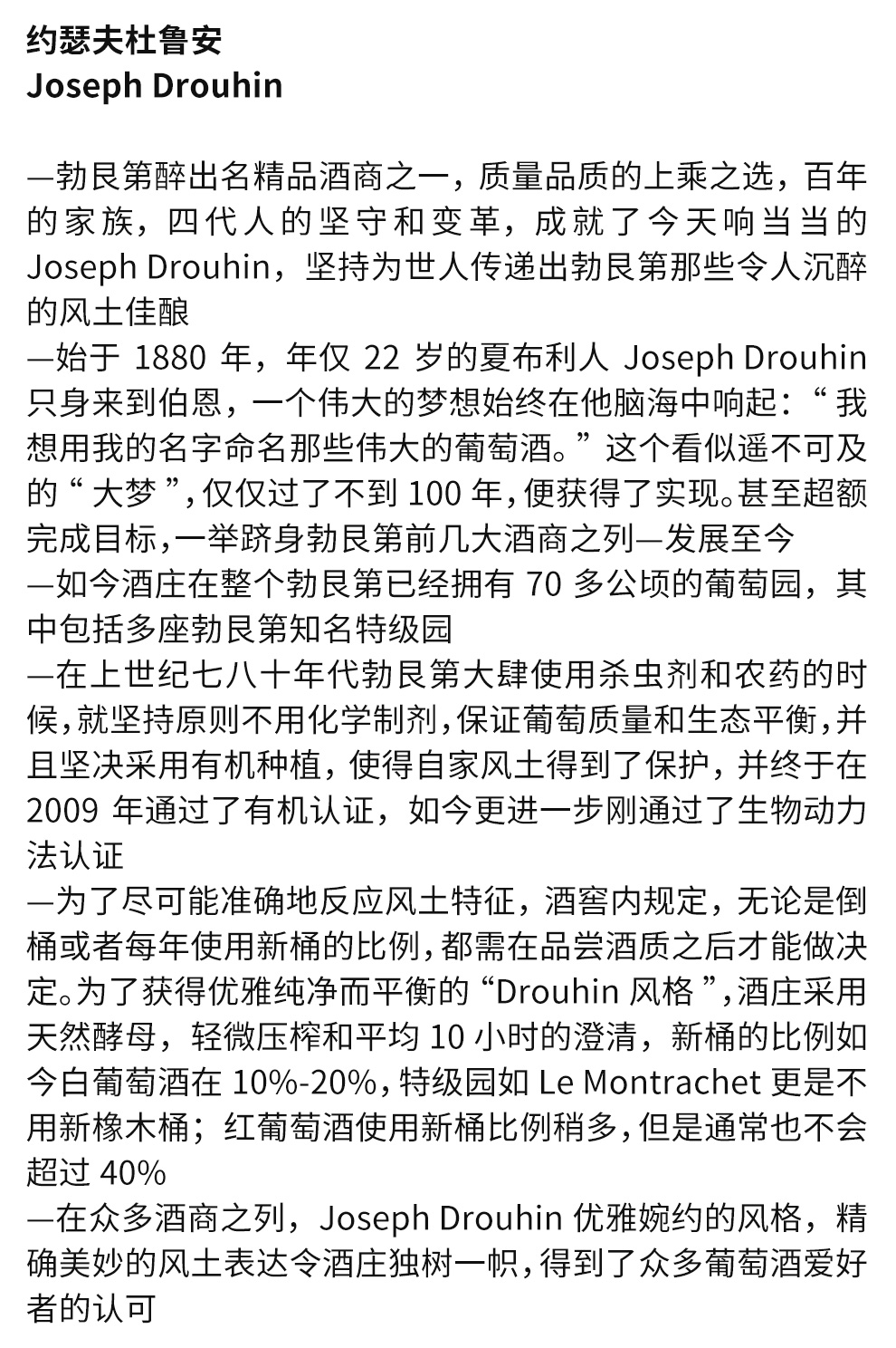 散发出红樱桃、花香、柑橘皮及乳脂般的新橡木香气。酒体中等至饱满,丰富且有层次感,果味核心提供了多汁的口感,单宁结构精细。