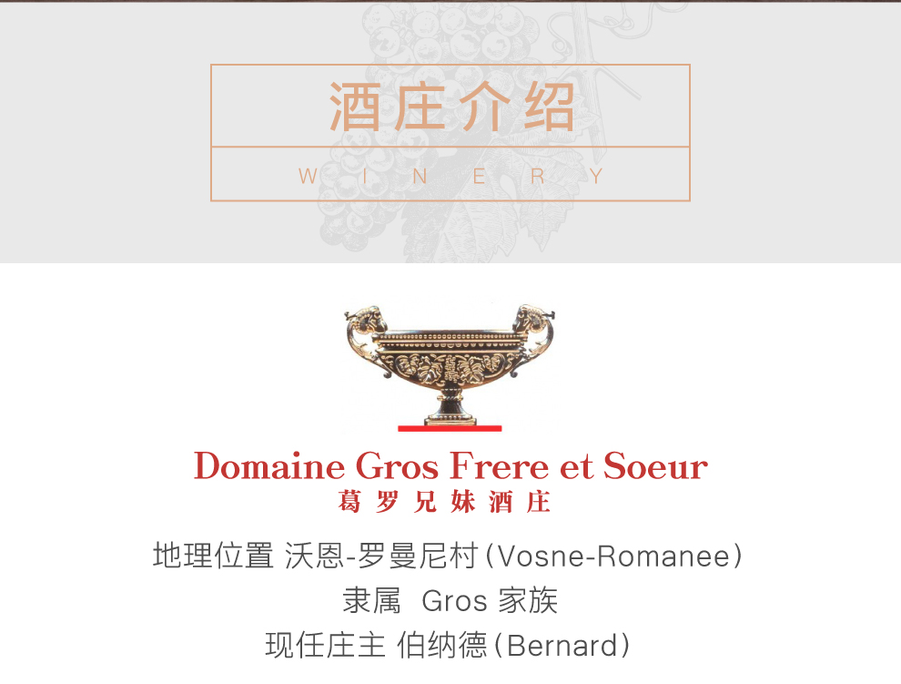 Gros 家族是Vosne-Romanee村著名的酿酒世家,酒庄经过了Louis和Jean Gros(现任庄主Bernard的父亲,曾经担任本村两任的市场)两代的辛勤经营,创造出了备受瞩目的酿酒王朝,成为仅次于Domaine Romanee-Conti的超明星酒庄。