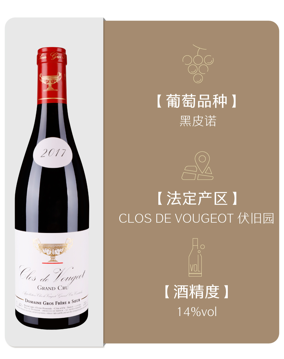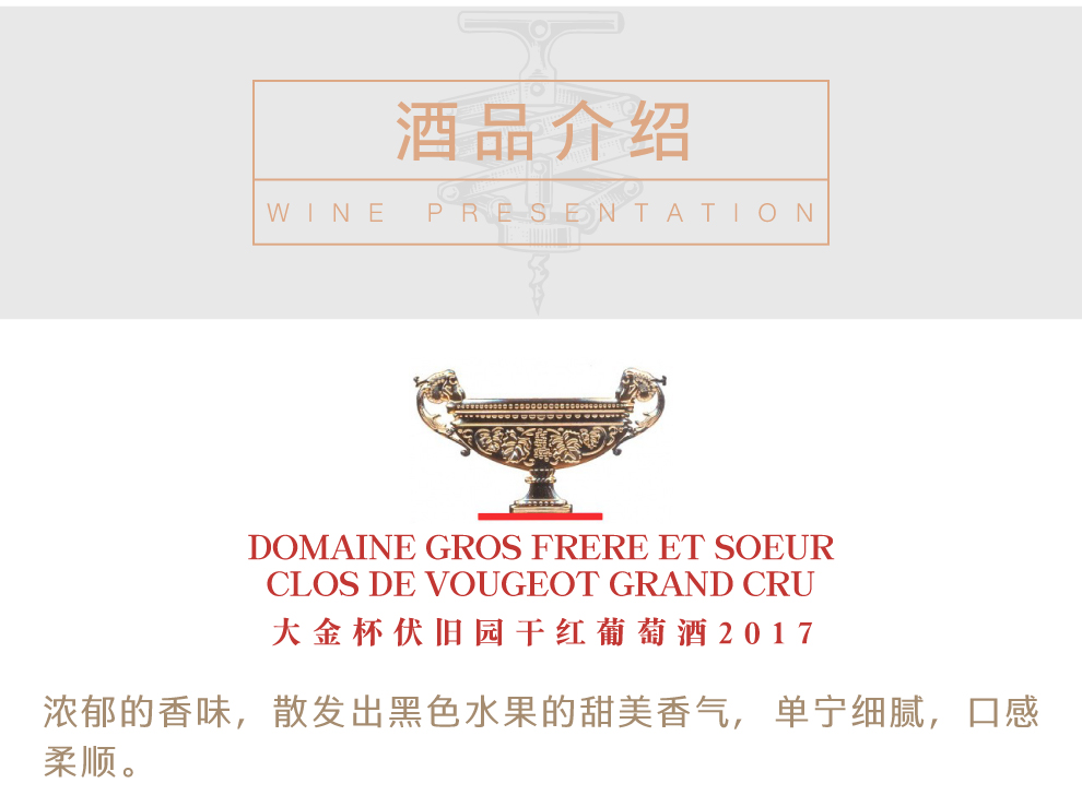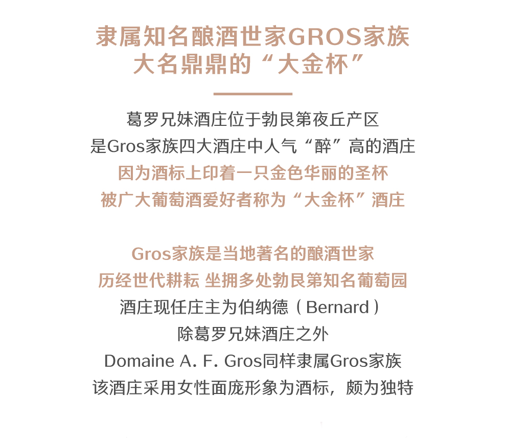 Domaine Gros Frere & Soeur 是勃艮第Cotes de Nuits (夜丘)Vosne-Romanee村Gros 家族四大酒庄中人气最高的酒庄。因为酒标上印着一只金色华丽的圣杯,台湾的勃艮第酒友就给他取了个“大金杯”的外号。