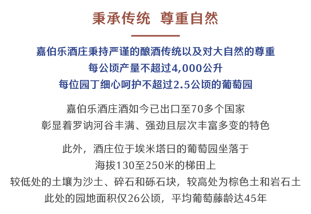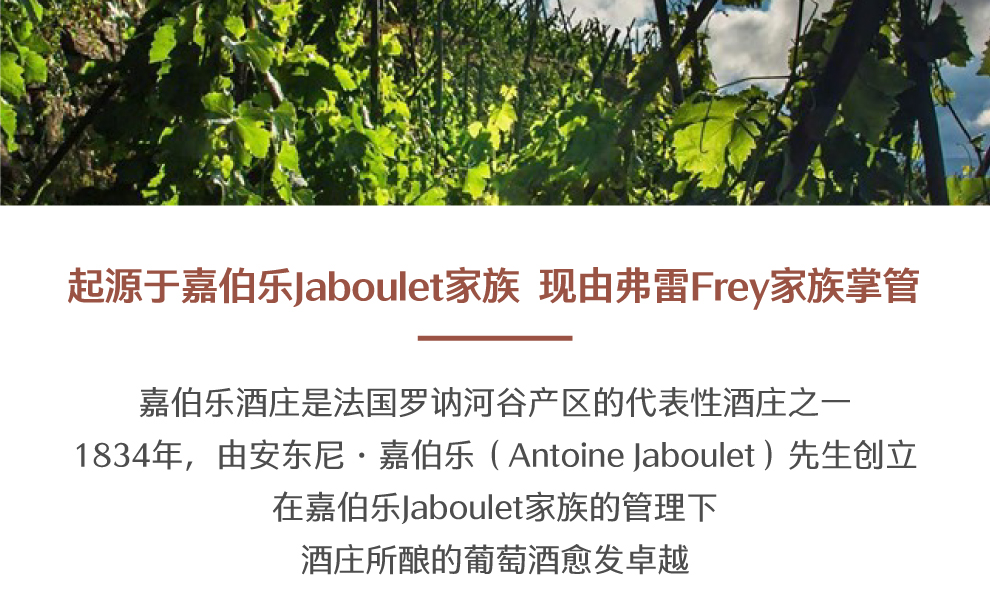 嘉伯乐酒庄(Domaine Paul Jaboulet Aine)是法国罗纳河谷产区最著名也是最具代表性的酒庄,1834年由安东尼•嘉伯乐(Antoine Jaboulet)先生创立至今,目前已发展成为拥有上百公顷葡萄园、年产酒量近400万瓶的超级酒庄。