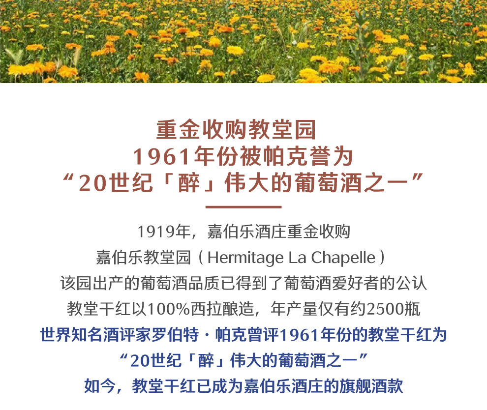 法国罗纳河谷产区最著名最具代表性的酒庄。拥有上百公顷葡萄园、年产酒量近400万瓶的超级酒庄。嘉伯乐教堂园(Hermitage La Chapelle)的顶级红葡萄酒嘉伯乐教堂园红葡萄酒已经被收列为全世界最出众的红葡萄酒之列。出口至70多个国家,高雅却平价的好酒,完美地呈现了罗纳河谷产区酒的特色