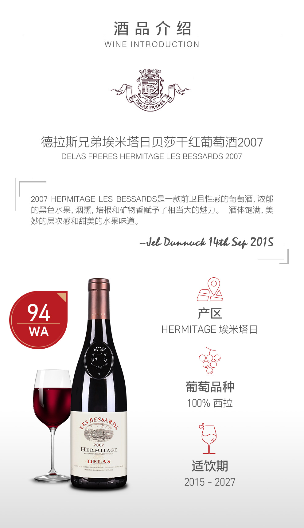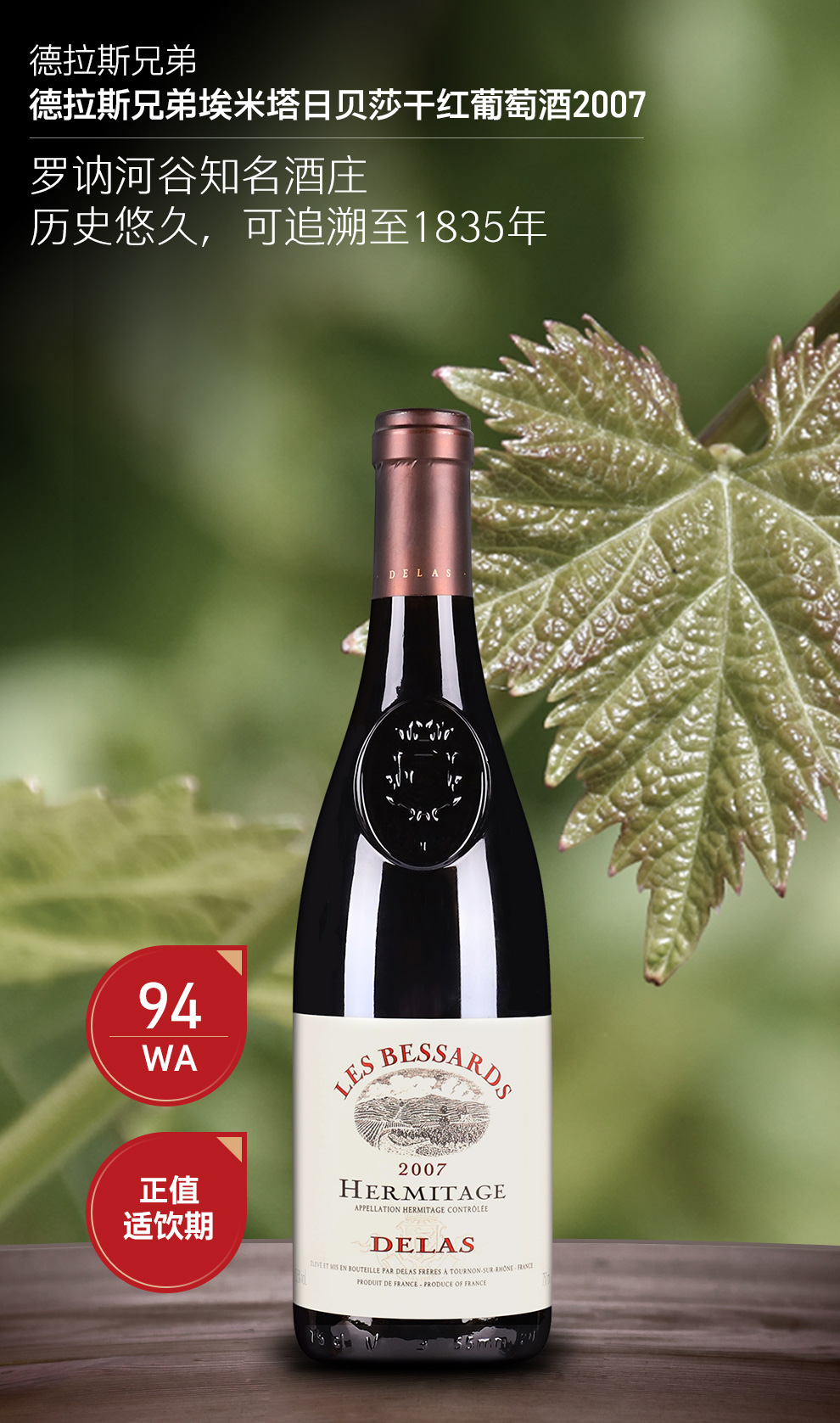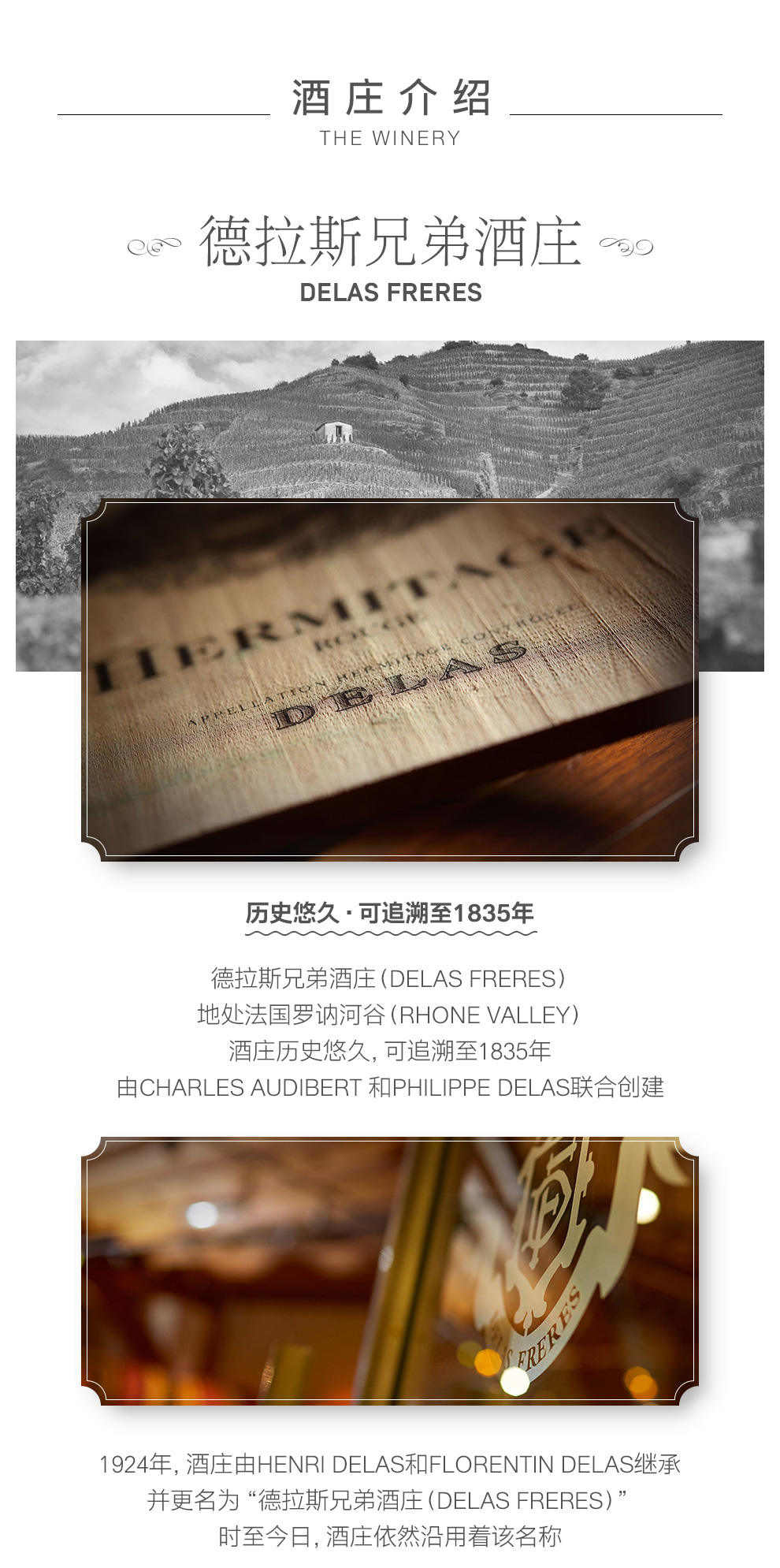德拉斯兄弟酒庄的历史可以追溯到1835年,当时,创始人查理斯·奥迪伯特(Charles Audibert )和菲利普·德拉斯(Philippe Delas )共同买下了图尔农的一家葡萄酒公司,并将其改名为“奥迪伯特和德拉斯兄弟酒庄(Audibert et Delas)”。1924年,亨利·德拉斯(Henri Delas)和弗罗伦丁·德拉斯(Florentin Delas)接手酒庄并将酒庄改名为“德拉斯兄弟酒庄(Delas Freres)”,并一直沿用至今。两兄弟接手酒庄之后,继续扩张酒庄的葡萄园,陆续在教皇新堡(Chateauneuf-du-Pape)和埃米塔日(Hermitage)等地区买下了葡萄园,持续生产品质稳定的葡萄酒。