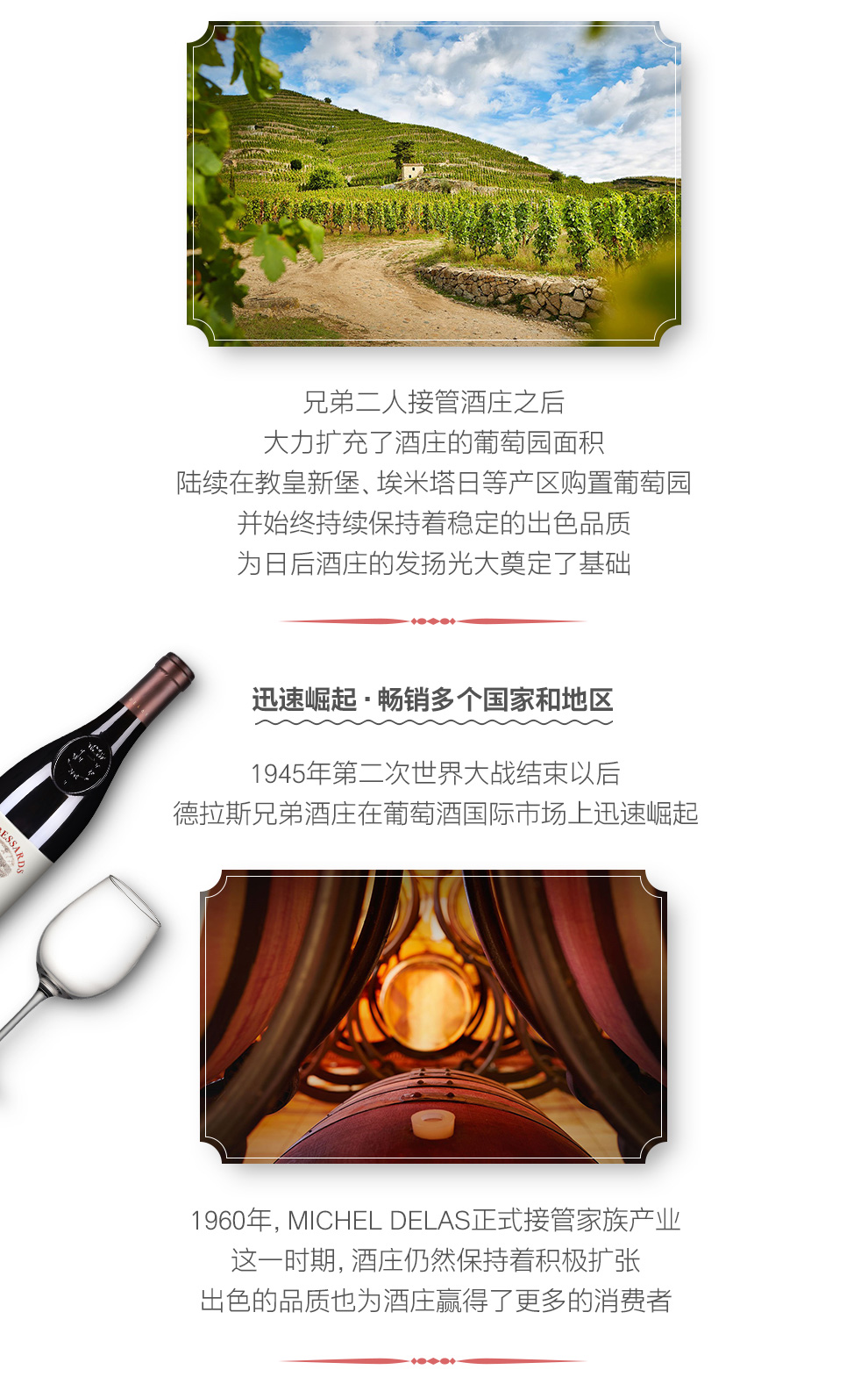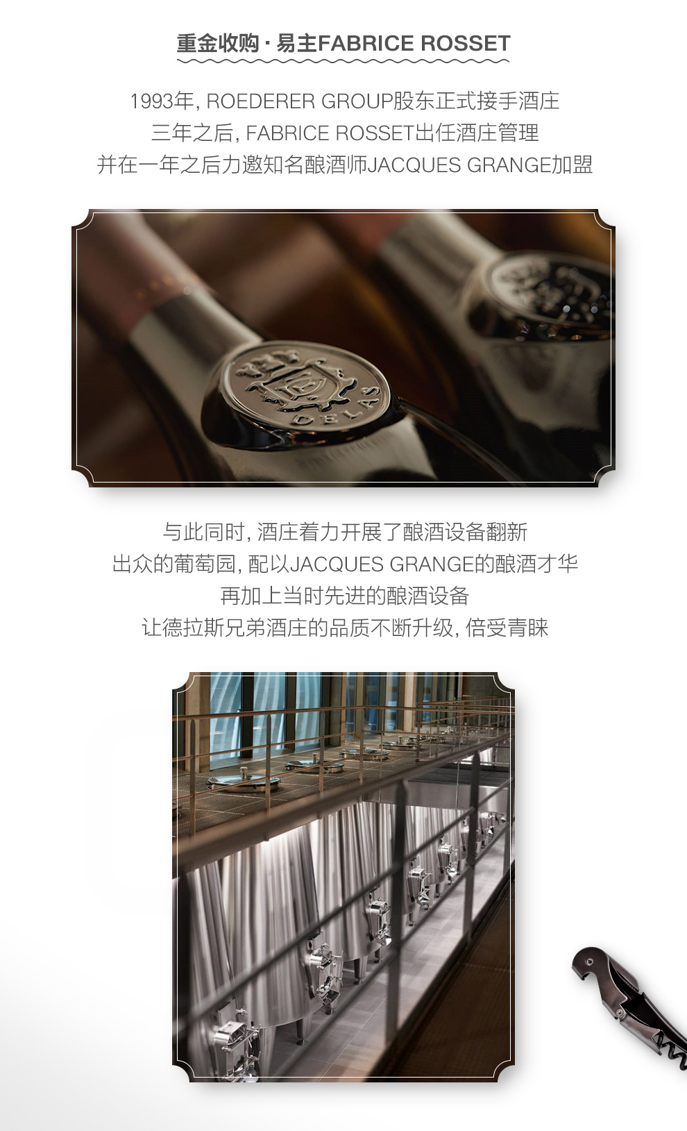 1945年二战以后,德拉斯兄弟酒庄在葡萄酒国际市场上迅速崛起。1960年,被家族寄以厚望的米歇尔·德拉斯(Michel Delas)接管了公司的经营,他通过对其他公司的收购,持续增持着德拉斯兄弟酒庄的股份。1993年,王妃集团(Roederer Group)的大股东接手了德拉斯兄弟酒庄,德拉斯兄弟酒庄持续蓬勃发展。1996年,法布斯·罗塞特(Fabrice Rosset)接管德拉斯兄弟酒庄,开始对酒庄进行翻新,并在后一年邀请了酿酒师杰克·格朗兹(Jacques Grange)加入德拉斯兄弟酒庄担任技术总监。