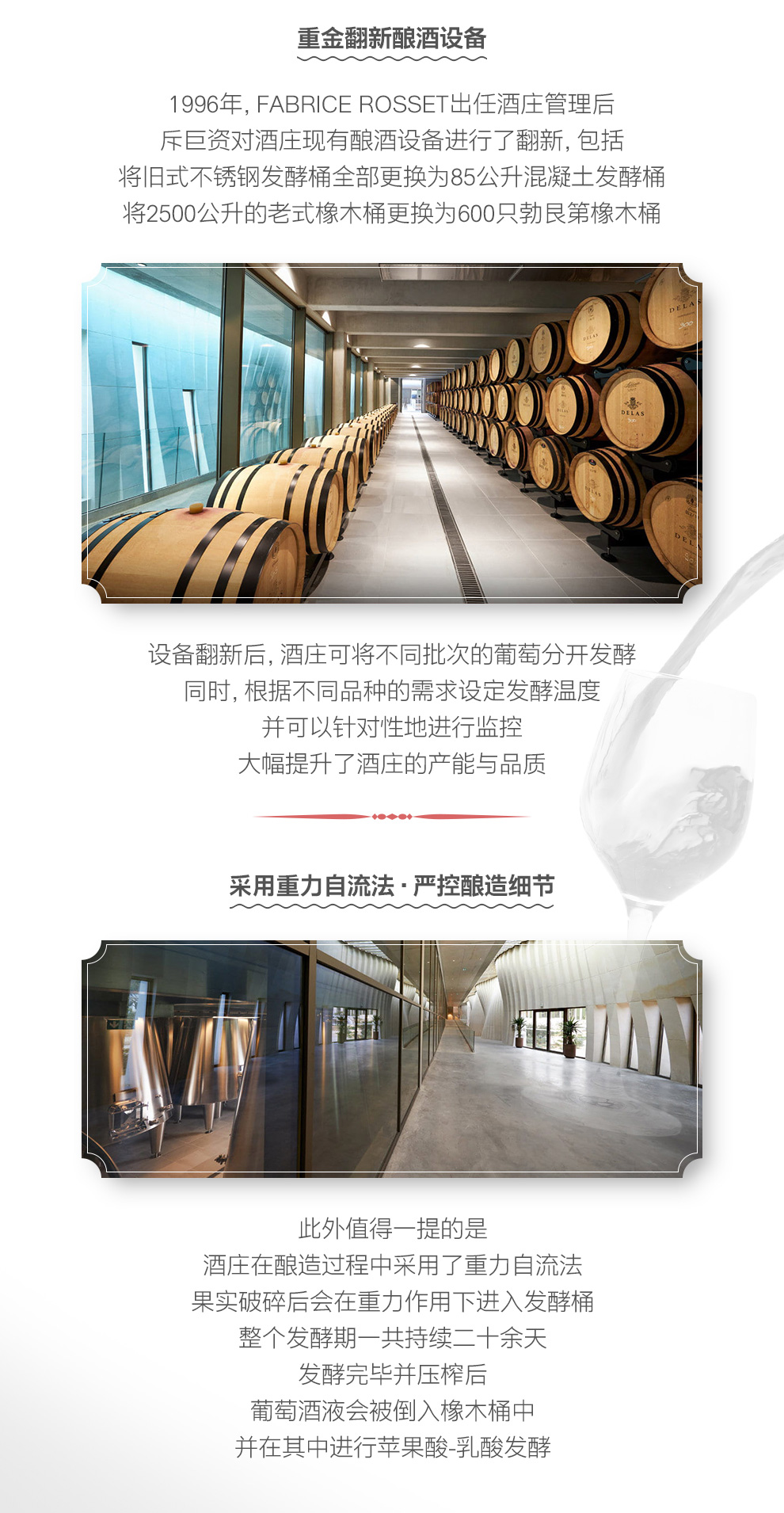 德拉斯兄弟酒庄的葡萄均为手工采摘,果实完整,不容易提前破碎影响风味。1996年德拉斯兄弟酒庄进行翻新,将旧式不锈钢发酵桶全部更换成了85公升混凝土发酵桶,2500公升的老式橡木桶也已被600只勃艮第橡木桶所取代。设备翻新后,酒庄可以将不同批次的葡萄分开发酵,根据不同品种的需求设定发酵温度,并可以针对性地进行监控。酒庄在酿造过程中使用重力自流法,果实破碎后在重力作用下倒进发酵桶。发酵采用传统发酵法,整个发酵期一共持续二十余天,发酵完毕并压榨后,葡萄酒液会被倒入橡木桶中,并在其中进行苹果酸-乳酸发酵。