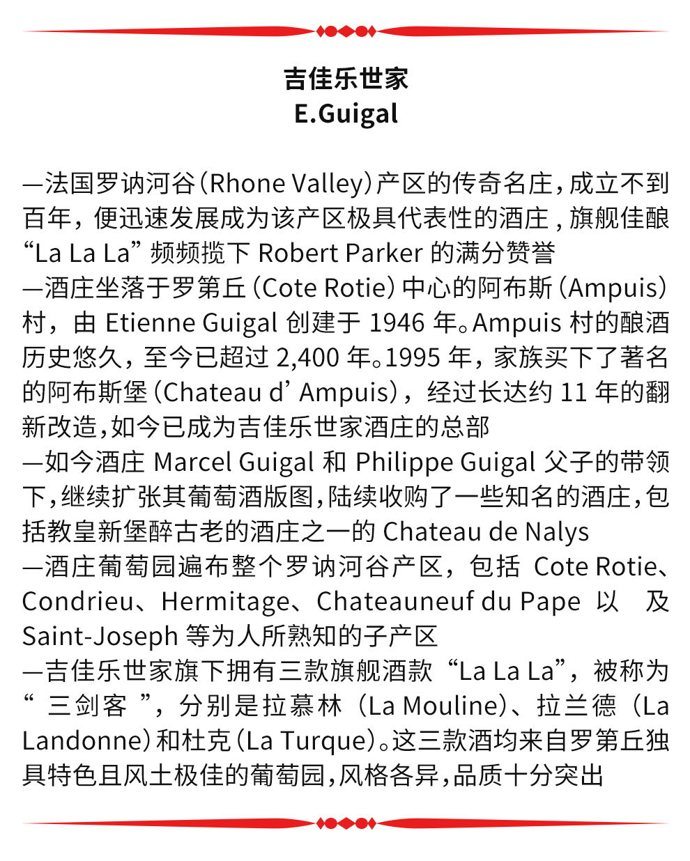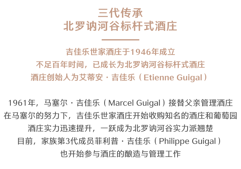 吉佳乐世家酒庄(E. Guigal)是罗第丘(Cote-Rotie)最富盛名,也是最重要的酒庄。1946年,艾蒂安•吉佳乐(Etienne Guigal)在罗第丘的酿酒中心阿布斯村(Ampuis)创建了该酒庄。阿布斯村历史悠久,其葡萄园已有超过2,400年的历史,至今仍保留着罗马时代的建筑物。1923年,14岁的艾蒂安•吉佳乐来到这里。他决定投身于酿酒业,一干就干了67年多。在1961年,年轻的马塞尔•吉佳乐(Marcel Guigal)接替了父亲管理酒庄。在马塞尔的努力下,吉佳乐世家酒庄开始收购一些知名的酒庄,实力不断提升。现在,该家族的第3代成员菲利普•吉佳乐(Philippe Guigal)担任着该酒庄的酿酒师,与伯尔纳德(Bernadette)、马塞尔(Marcel)一起构成酒庄的核心力量。