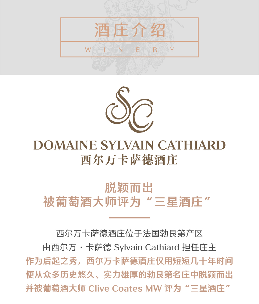 西尔万卡萨德酒庄(Domaine Sylvain Cathiard)位于法国的著名葡萄酒产区勃艮第(Burgundy),是这个明星产区的后起之秀。短短几十年时间,西尔万卡萨德便从勃艮第众多历史悠久的酒庄中脱颖而出,成为当地最顶尖的酒庄之一,并被克莱夫科茨(Clive Coates)评为三星酒庄,其出品的特级园和一级园黑皮诺红葡萄酒(Pinot Noir)售价颇高,已经成为黑皮诺爱好者的膜拜酒。