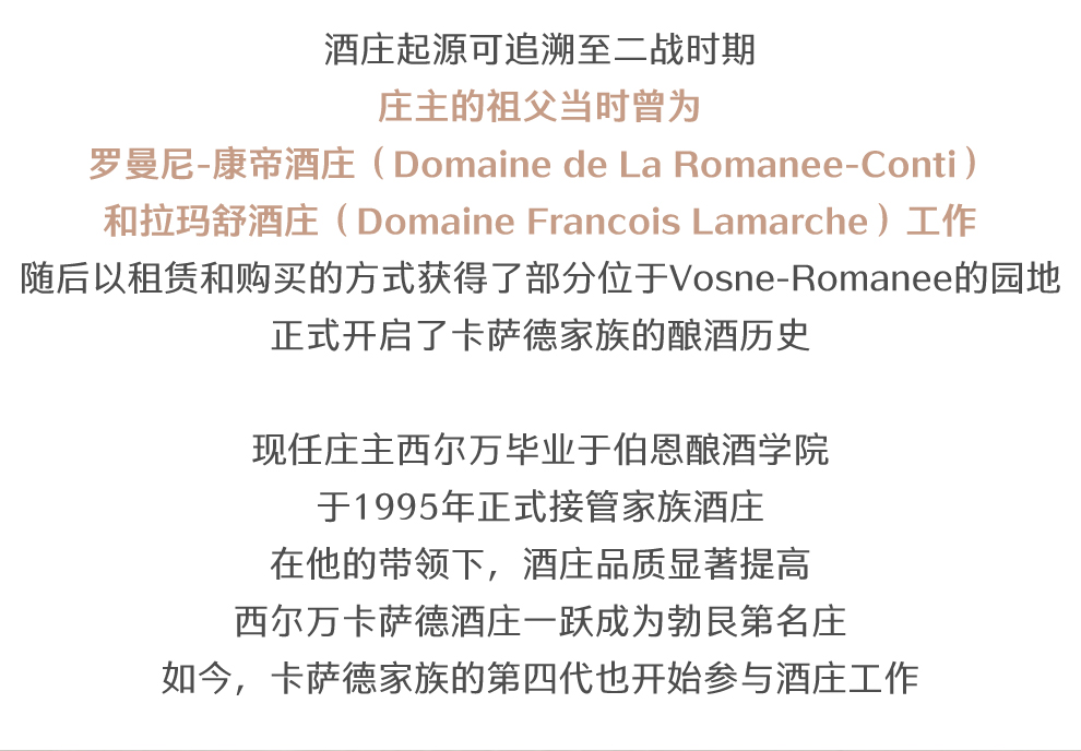 西尔万·卡萨德酒庄的起源可以追溯到二战时期,当时西尔万的祖父阿尔弗雷德(Alfred)为罗曼尼-康帝(Domaine de La Romanee-Conti)和拉玛舒酒庄(Domaine Francois Lamarche)的葡萄园工作。后来他开始陆续以租赁和购买的方式获得了部分位于沃恩-罗曼尼(Vosne-Romanee)等地区的葡萄园,开启了卡萨德家族的酿酒历史。起初,酒庄酿造的葡萄酒主要卖给酒商,到了五十年代,弗雷德和儿子安德烈(Andre)才开始以酒庄的名义出售瓶装葡萄酒。安德烈从1969年开始经营酒庄,他的儿子西尔万从伯恩酿酒学院(Ecole Viticole in Beaune)毕业后,也加入了酒庄工作。1995年,西尔万正式成为酒庄的掌门人,在他的努力下,酒庄出产的葡萄酒品质明显提高,一跃成为勃艮第地区的顶级酒庄,并且开始进军国际市场。2005年,家族的第四代酿酒师塞巴斯蒂安(Sebastien)在波尔多(Bordeaux)和新西兰等地磨砺之后,也开始参与家族的酿酒事业,并于2011年开始独挑大梁,成为酒庄的酿酒师。