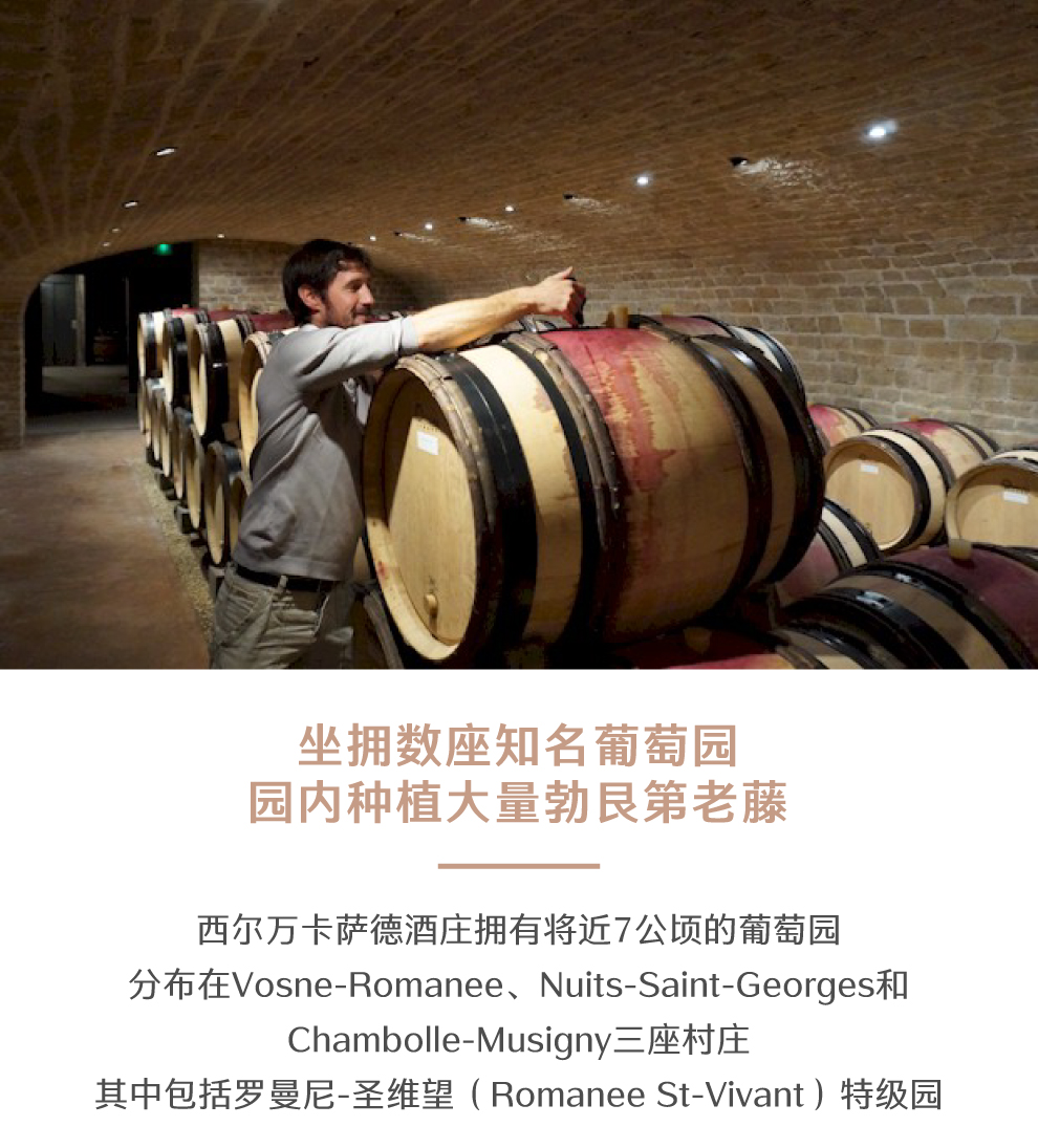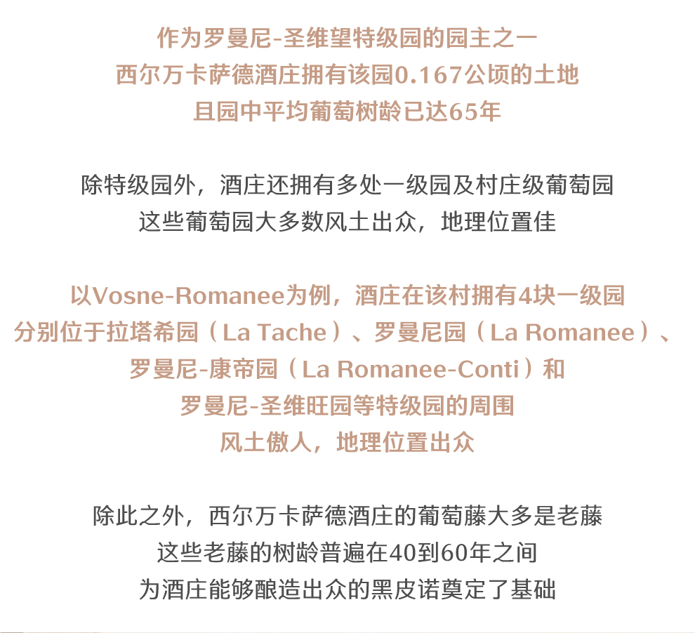 和许多勃艮第的酒庄一样,西尔万卡萨德的葡萄园并不是集中于某一片区域,而是零星散落在夜丘区(Cote de Nuits)的沃恩-罗曼尼(Vosne-Romanee)、夜圣乔治(Nuits-Saint-Georges)和香波-慕西尼(Chambolle-Musigny)三个村庄中。在酒庄近7公顷的葡萄园中,最负盛名的是位于沃恩-罗曼尼村的罗曼尼-圣维旺(Romanee St-Vivant)特级园。西尔万卡萨德在此拥有0.167公顷的土地,园中平均树龄已达65年。在沃恩村,酒庄还拥有1.437公顷的四块一级园,分别位于拉塔希园(La Tache)、罗曼尼园(La Romanee)、罗曼尼-康帝园(La Romanee-Conti)和罗曼尼-圣维旺园等特级园的周围。此外,西尔万酒庄还有0.79公顷的村庄级沃恩葡萄园。在香波-慕西尼,西尔万卡萨德耕种了0.456公顷的一级园。酒庄剩下的两个一级园产区位于夜圣乔治。西尔万卡萨德大部分的葡萄树都是老藤,树龄在40到60年之间,这是酒庄酿造出顶级勃艮第黑皮诺的一个重要因素。西尔万卡萨德酒庄崇尚有机种植。在葡萄园养护方面,十分关注土壤的微生物健康和园区的生物多样性。它的种植理念是顺其自然,维持园区原本的生态系统,从而让葡萄树在没有人工干预的情况下,自然抵御病虫害。当然,如果病虫害的威胁程度超过了阈值,酒庄也会采用适当的化学干预。