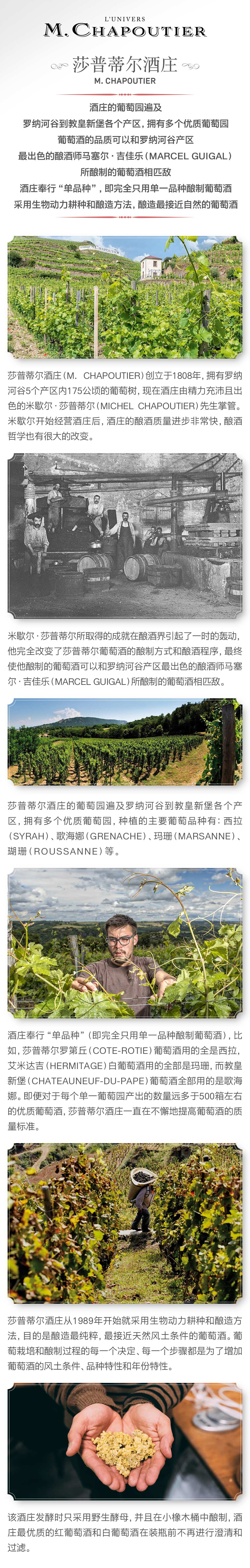 莎普蒂尔酒庄(M. Chapoutier)创立于1808年,拥有罗纳河谷5个产区内175公顷的葡萄树,现在酒庄由精力充沛且出色的米歇尔·莎普蒂尔(Michel Chapoutier)先生掌管。米歇尔开始经营酒庄后,酒庄的酿酒质量进步非常快,酿酒哲学也有很大的改变。米歇尔·莎普蒂尔所取得的成就在酿酒界引起了一时的轰动,他完全改变了莎普蒂尔葡萄酒的酿制方式和酿酒程序,最终使他酿制的葡萄酒可以和罗纳河谷产区最出色的酿酒师马塞尔·吉佳乐(Marcel Guigal)所酿制的葡萄酒相匹敌。