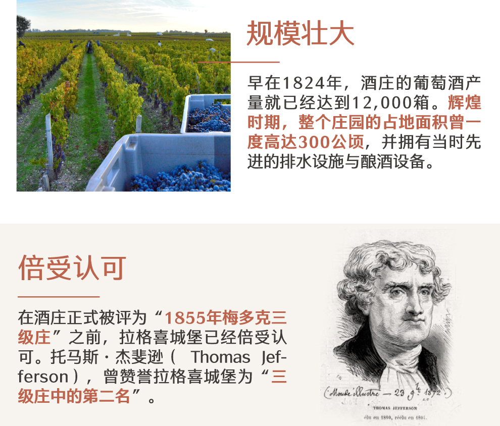 日本三得利集团接手已走下坡路的拉格喜庄园后,马上投入大量资金修葺酒庄,研发了拉格喜庄特有的酿酒控温设备。提高地窖的通风性和闭光性,以使得葡萄酒更浓郁和新鲜。同时经过周密的计划,他们降低了产量以提升质量,开始严格挑选葡萄,并在栽种之前选择优良的葡萄品种,结合自己的酿酒特点,分配种植比例。从外地聘用了经验更加丰富,技术更加上乘的植物学家指导和督促葡萄栽种及选用的全过程。他们以锲而不舍,追求至善至美的执着精神,让葡萄酒的质量产生了戏剧性的变化,酒庄名声也得以重振,重返昔日光辉,达到二级甚至一级水准。1855年酒庄顺利晋升为波尔多三级酒庄后,酒庄主人将每年80%的酒出口到国外,保证了酒庄良好的收益,从而实现持续发展和进步的计划。