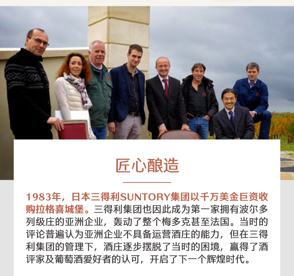 1983年,日本三得利(Suntory)老板怀着拥有波尔多列级名庄的梦想,与法国政府缠斗2年多后,终于在这一年以千万美金接手拉格喜庄园,成为第一个踏进法国文化财产禁区——波尔多列级名庄的亚洲企业。这也成为当时轰动整个梅多克甚至法国的大事件,因为在这之前,把酒庄卖给亚洲人,这在整个法国的酒庄是想都不敢想的。