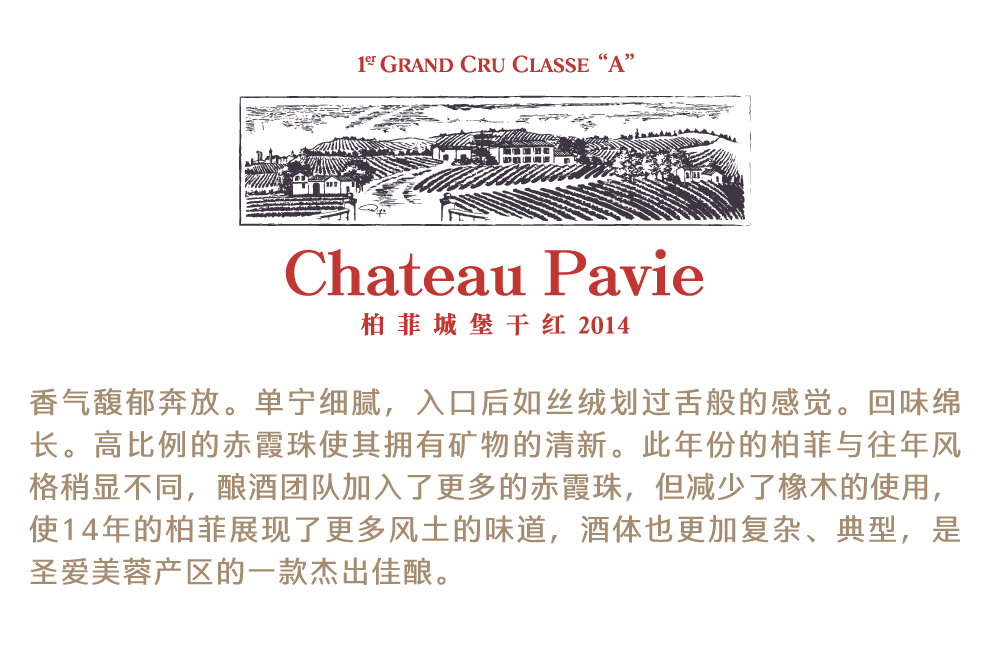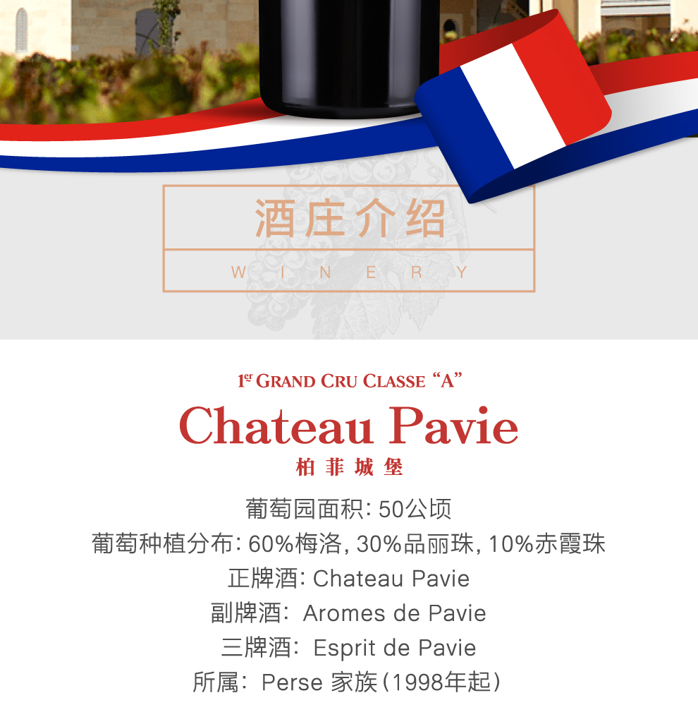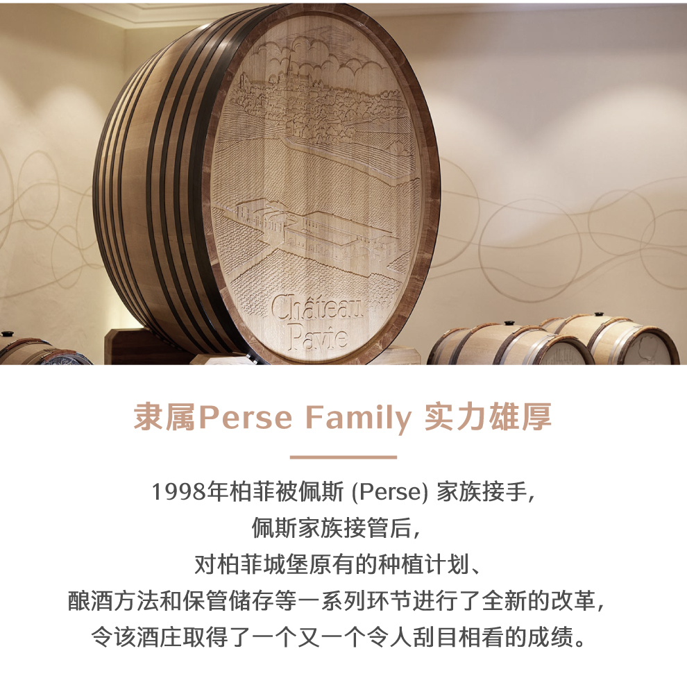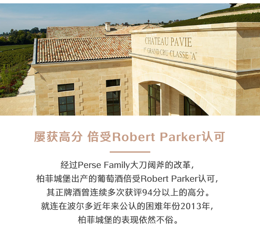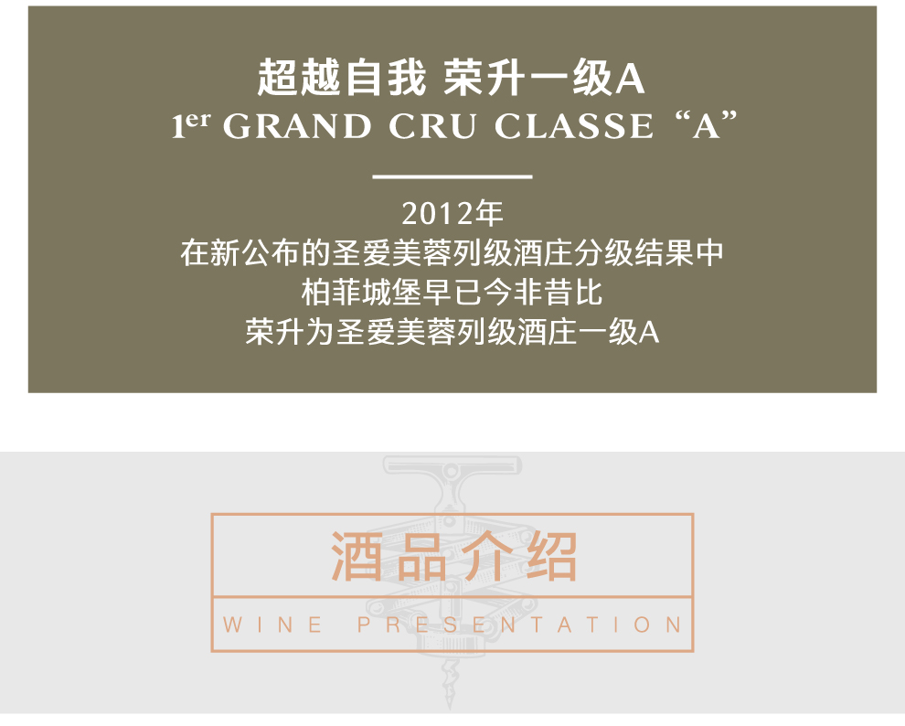 柏菲城堡地处法国波尔多右岸圣爱美蓉产区,其历史可追溯至距今1600多年前的公元4世纪。之后几经辗转1998年柏菲被佩斯 (Perse) 家族接手,佩斯家族接管后,对柏菲城堡原有的种植计划、酿酒方法和保管储存等一系列环节进行了全新的改革,令该酒庄取得了一个又一个令人刮目相看的成绩。