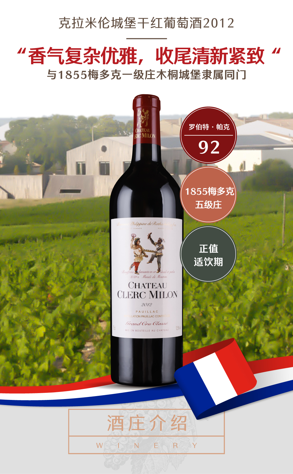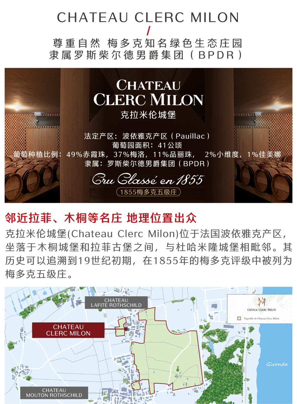 克拉米伦庄园坐落在波依亚克产区,位于木桐庄园和拉菲庄园之间,与杜哈米伦庄园相毗邻。酒庄名字中的Milon,是Pauillac产区内的村庄名,而clerc则是1855年酒庄被评为五级酒庄时的酒庄拥有者。