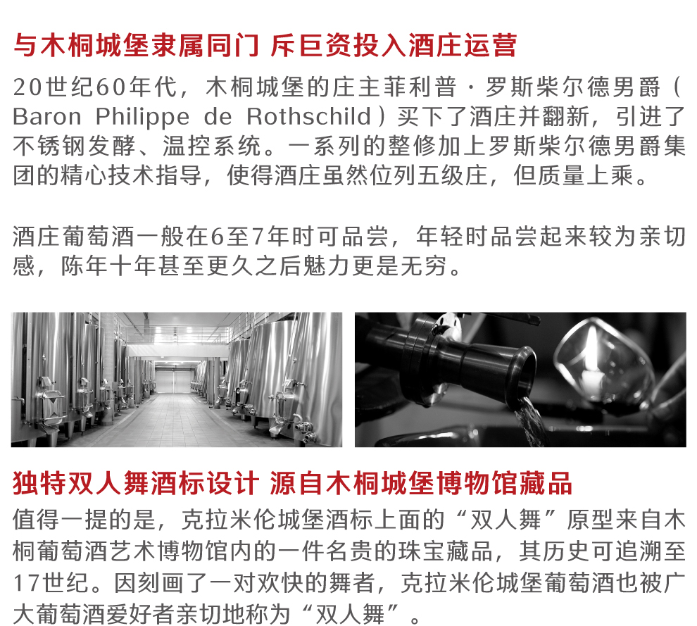 1970年,庄园卖给了菲利普•罗斯柴尔德男爵(Philippe de Rothschild)。随后的十年里,庄园接受了大量的投资,包括酒窖的革新,当然还有不锈钢控温发酵设备的引进。罗斯柴尔德家族努力的成果已经通过从八十年代早期的一系列出色的葡萄酒表现了出来。克拉米伦庄园本身的葡萄园位于波依雅克,接近穆塞特(Mousset)。在这里,菲利普•罗斯柴尔德男爵的女儿纵览克劳米伦庄园、木桐庄园(Mouton Rothschild)以及达玛雅克庄园(D’Armailhac)的全程运作,还跟随时代的步伐,致力于发展其他一些令她感兴趣的位于智利(活灵魂Almaviva)和加州(作品一号Opus One)的庄园。同时,她还参与了其酒业的品牌方面的运作——比如著名的Mouton Cadet。
